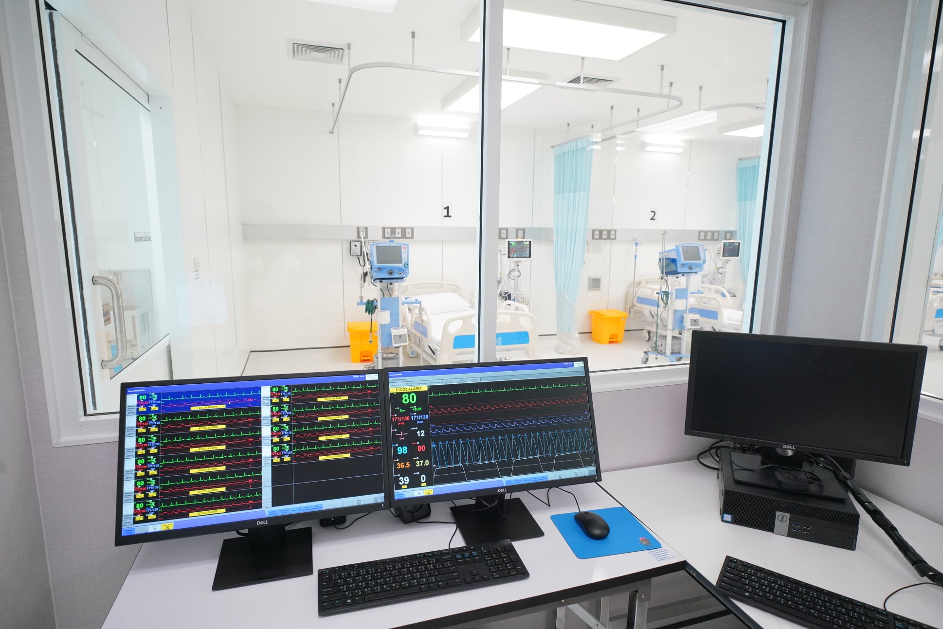 - 2. NURSING STATION ZONE สำหรับพยาบาลที่ดูแลผู้ป่วย โดยแบ่งเป็น MONITOR ROOM สำหรับพยาบาลที่ดูแลเฝ้าระวัง และ STAND-BY ROOM สำหรับพยาบาลที่เตรียมสวมชุด PPE พร้อมสำหรับเข้าไปดูแลผู้ป่วย ICU โดยระบบการจัดการอากาศใน ZONE นี้ใช้ระบบห้องความดันบวก (POSITIVE PRESSURE ROOM)