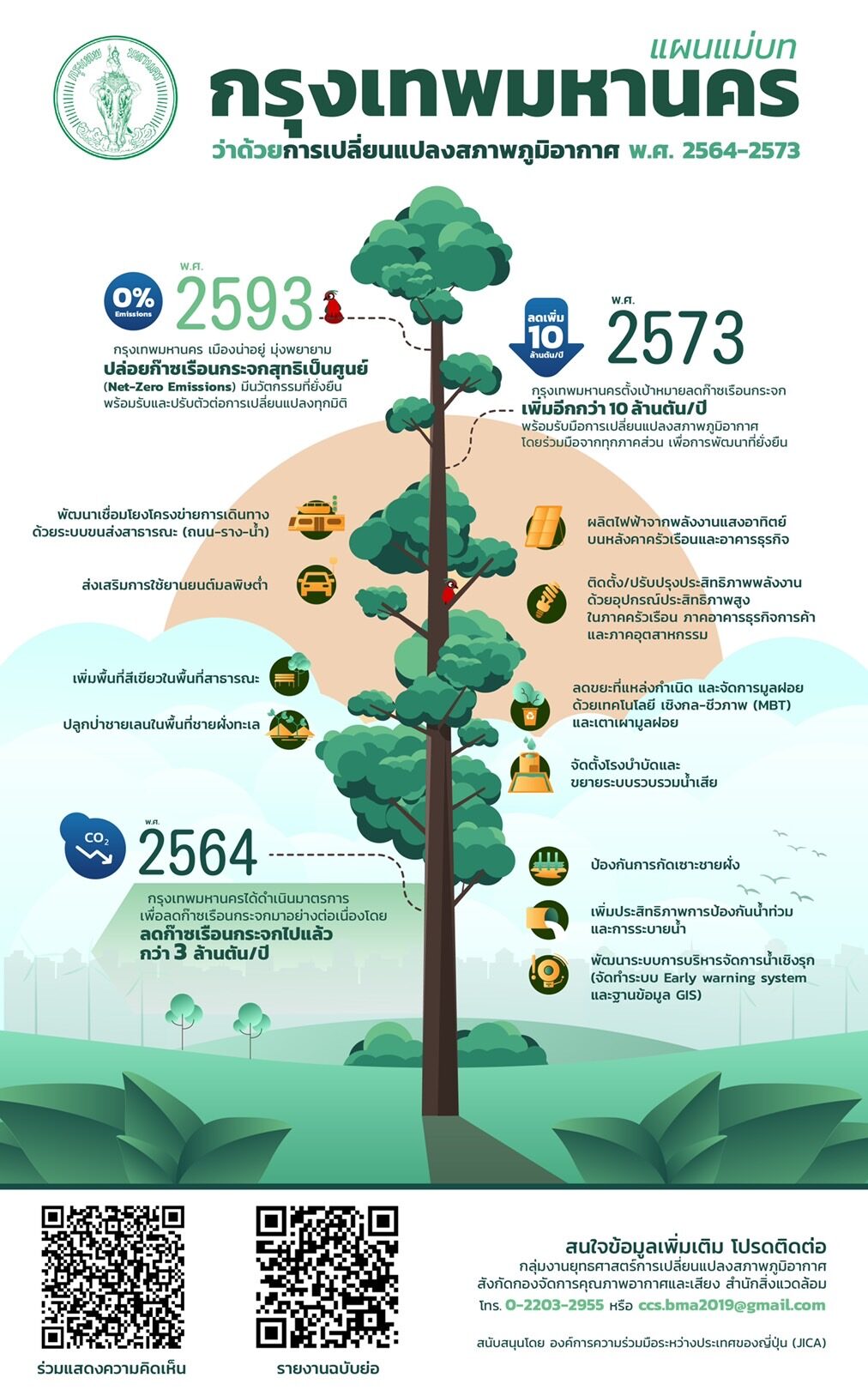 พล.ต.อ.อัศวิน กล่าวว่า กทม. ร่วมกับองค์การความร่วมมือระหว่างประเทศของญี่ปุ่น หรือ ไจก้า (Japan International Cooperation Agency: JICA) จัดทำแผนแม่บทกรุงเทพมหานครว่าด้วยการเปลี่ยนแปลงสภาพภูมิอากาศ พ.ศ. 2564 – 2573 ตามวิสัยทัศน์ว่าด้วยการเปลี่ยนแปลงสภาพภูมิอากาศ พ.ศ. 2573 “กรุงเทพมหานครมุ่งสู่เมืองสีเขียวที่น่าอยู่ พร้อมรับมือการเปลี่ยนแปลงสภาพภูมิอากาศ โดยร่วมมือจากทุกภาคส่วนเพื่อการพัฒนาที่ยั่งยืน” และวิสัยทัศน์ว่าด้วยการเปลี่ยนแปลงสภาพภูมิอากาศ พ.ศ.2593 “กรุงเทพมหานครเมืองน่าอยู่ มุ่งพยายามในการปล่อยก๊าซเรือนกระจกสุทธิเป็นศูนย์ มีนวัตกรรมที่ยั่งยืน พร้อมรับและปรับตัวต่อการเปลี่ยนแปลงทุกมิติ” โดยแผนแม่บทฯ ถูกจัดทำขึ้นให้มีความสอดคล้องตามความตกลงปารีสและการดำเนินงานด้านการเปลี่ยนแปลงสภาพภูมิอากาศของประเทศไทยทั้งในแง่ของเป้าหมายและแผนการดำเนินงาน เพื่อให้แผนแม่บทฯ ถูกผลักดันและมีการดำเนินการอย่างต่อเนื่องจนบรรลุเป้าหมายในที่สุด