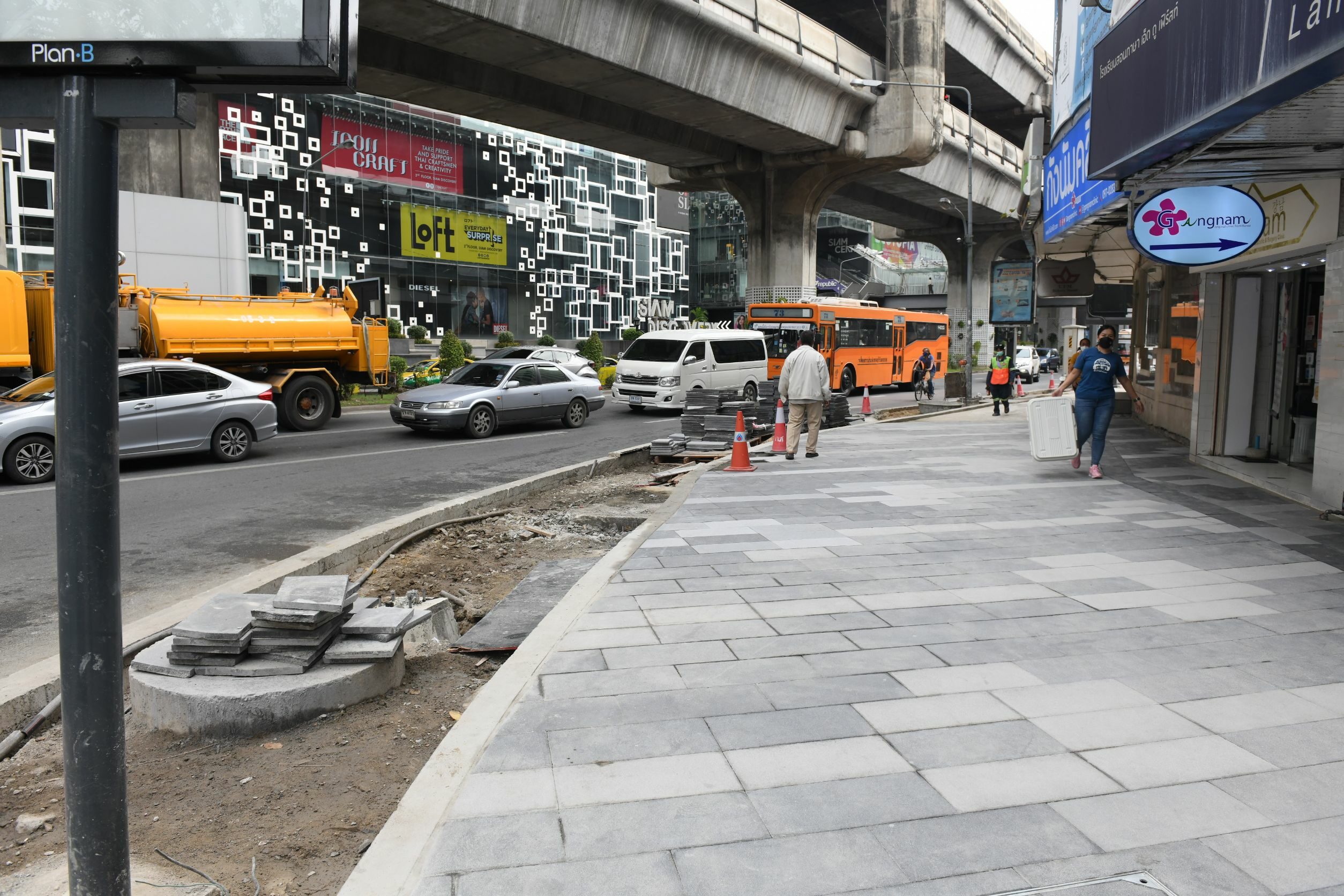 ติดตั้งให้ชิดอยู่ใกล้ทางเท้า และผสานให้อยู่แนวเดียวกับพื้นที่สีเขียวให้มากที่สุด 2.เมื่อมีแนวพื้นทางเท้าที่ไม่ต้องขุด โครงสร้างพื้นทางเท้าสามารถใช้คอนกรีตเสริมเหล็ก สำหรับถนนคนเดินสายหลักให้คงทน และปูกระเบื้องทับให้มีความสวยงาม 3.ขยายทางเท้าให้มีความกว้างอย่างน้อย 2.4 เมตร ตามมาตรฐานสากล โดยจัดระเบียบป้าย เสาไฟ พื้นที่สีเขียว ให้อยู่ในแนวเดียวกัน ทำฐานป้ายทุกป้าย ฐานเสาทุกอุปกรณ์บนถนนให้เรียบเสมอทางเท้า และปรับขนาดป้อมตำรวจให้มีขนาดเล็กลง 4.ปรับระดับทางเท้าให้สูงจากพื้นถนนไม่เกิน 10 เซนติเมตรเพื่อไม่ให้ชันกินไป 5.กำหนดแนวปลูกต้นไม้ให้ชัดเจน เป็นแนวเดียวกับการติดตั้งสาธารณูปโภค เสาไฟ และป้าย นอกจากเพื่อความร่มรื่นแล้ว ยังให้เป็นพื้นที่รับน้ำ (Rain Garden) โดยปรับองศาทางเท้า เพื่อให้น้ำไหลลงพื้นที่ Rain Garden ไม่ท่วมขังบนทางเท้าเมื่อฝนตก 6.ทำทางเท้าสำหรับคนพิการ และผู้สูงอายุ ที่มีแผ่นทางเท้าคนพิการ (Braille Block) และทางลาดเชื่อมต่อทางเดินอย่างปลอดภัย