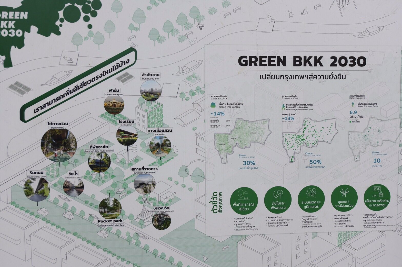 นางศิลปสวย กล่าวว่า กทม.ตระหนักถึงเรื่องสิ่งแวดล้อมเป็นสำคัญ โดยเฉพาะการหาพื้นที่ในการจัดทำสวนสาธารณะจะค่อนข้างยากโดยเฉพาะใจกลางเมือง กทม. โดยสำนักสิ่งแวดล้อม จึงได้ดำเนินโครงการ Green Bangkok 2030 เพื่อเพิ่มพื้นที่สีเขียวในกรุงเทพฯ ซึ่งเริ่มดำเนินโครงการมาตั้งแต่ปี 2562 โดยได้รับความร่วมมือจากหน่วยงานภาครัฐ ภาคเอกชน และประชาชน สนับสนุนพื้นที่เพื่อจัดทำเป็นสวนสาธารณะ ทำให้ในปัจจุบันกรุงเทพมหานครมีพื้นที่สีเขียวต่อจำนวนประชากรอยู่ที่ 7 ตร.ม./คน ทั้งนี้ เป้าหมายการเพิ่มพื้นที่สีเขียวให้เพียงพอต่อการให้บริการประชาชนตามมาตรฐานสากลที่ 10 ตร.ม./คน กำหนดให้ได้ภายในปี 2573 (ค.ศ. 2030) ซึ่งเป็นการเพิ่มการเข้าถึงพื้นที่สาธารณะสีเขียวให้ประชาชนในระยะ 400 เมตร และการเพิ่มพื้นที่ร่มไม้ต่อพื้นที่เมืองเป็นร้อยละ 30 ตามโครงการ Green Bangkok 2030