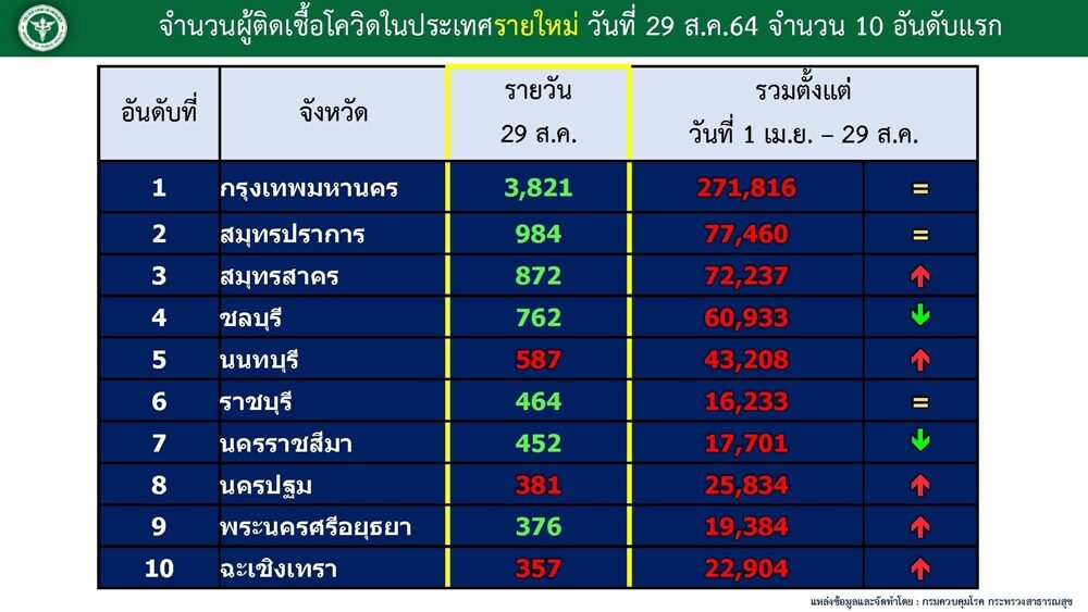 สำหรับ 10 อันดับจังหวัดที่มีจำนวนผู้ติดเชื้อโควิด-19 ในประเทศรายใหม่สูงสุด อันดับ 1 กรุงเทพมหานคร 3,821 ราย 2.สมุทรปราการ 984 ราย 3.สมุทรสาคร 872 ราย 4.ชลบุรี 762 ราย 5.นนทบุรี 587 ราย 6.ราชบุรี 464 ราย 7.นครราชสีมา 452 ราย 8.นครปฐม 381 ราย 9.พระนครศรีอยุธยา 376 ราย และ 10.ฉะเชิงเทรา 357 ราย