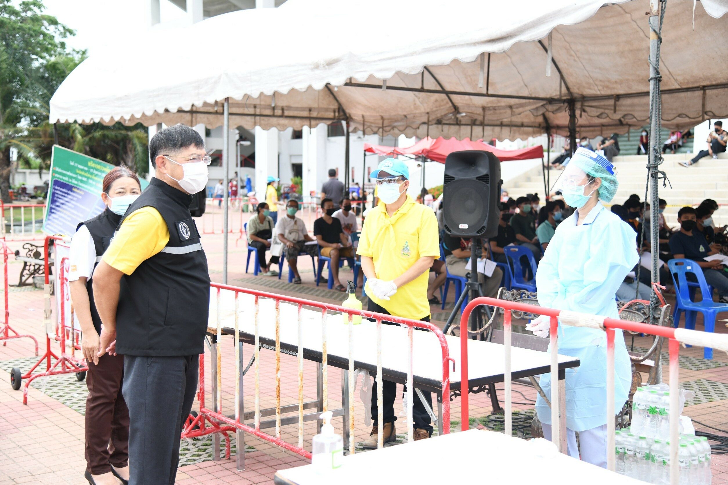จากนั้น เวลา 10.00 น. ลงพื้นที่ตรวจเยี่ยมการให้บริการตรวจคัดกรองเชื้อไวรัสโคโรนา 2019 (Covid-19) ณ สนามกีฬาเฉลิมพระเกียรติ 72 พรรษา ซอยคุ้มเกล้า 1/5 ถนนคุ้มเกล้า เขตมีนบุรี ซึ่งกรุงเทพมหานคร โดยสำนักอนามัย สำนักงานเขตกลุ่มเขตกรุงเทพฯตะวันออก ศูนย์บริการสาธารณสุขในพื้นที่กรุงเทพฯตะวันออก สนามกีฬาเฉลิมพระเกียรติ 72 พรรษา สำนักวัฒนธรรมกีฬาและการท่องเที่ยว ร่วมกับกองทัพอากาศ สน.ฉลองกรุง และ รพ.เวิลด์เมดิคอล ให้บริการตรวจคัดกรองเชื้อไวรัสโคโรนา 2019 (Covid-19) ด้วยการ SWAB ให้กับกลุ่มเป้าหมาย : ผู้มีความเสี่ยงสูง, ผู้ประกอบอาชีพเสี่ยง, ผู้ประกอบอาชีพที่ให้บริการหรือพบปะผู้คนจำนวนมาก และประชาชนทั่วไปที่มีความเสี่ยง โดยให้บริการตรวจคัดกรองฯวันละ 1,000 คน ระหว่างวันที่ 17 พ.ค.-30 มิ.ย.64 เวลา 09.00-14.00 น. (เริ่มแจกบัตรคิว 07.30 น.) ยกเว้นวันที่ 17-18 มิ.ย.64 ย้ายสถานที่ตรวจฯไปที่เคหะชุมชนร่มเกล้า เขตลาดกระบัง