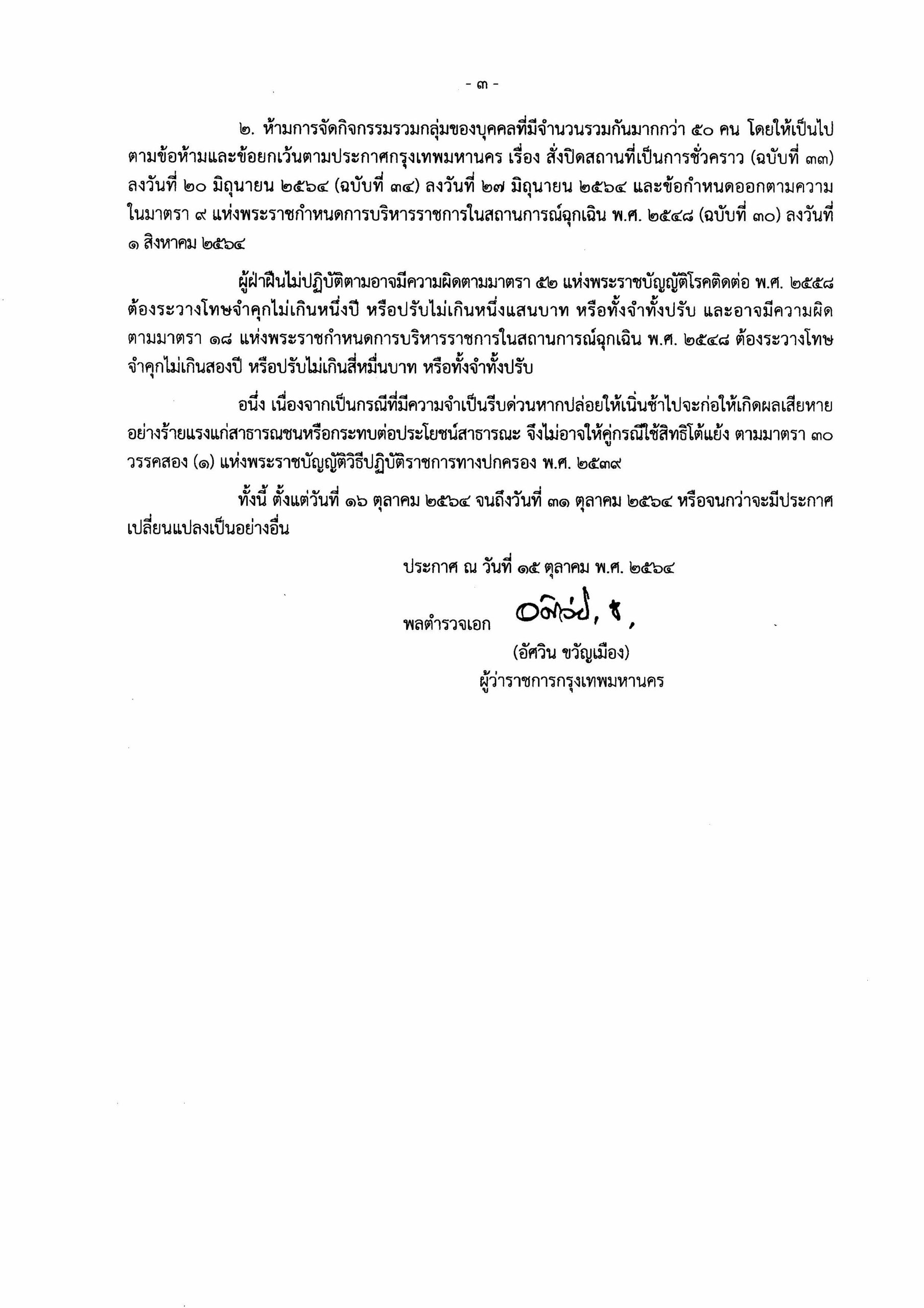 เมื่อวันที่ 15 ตุลาคม ประกาศกรุงเทพมหานคร เรื่อง สั่งปิดสถานที่เป็นการชั่วคราว (ฉบับที่ 44) โดยมีเนื้อหา ดังนี้