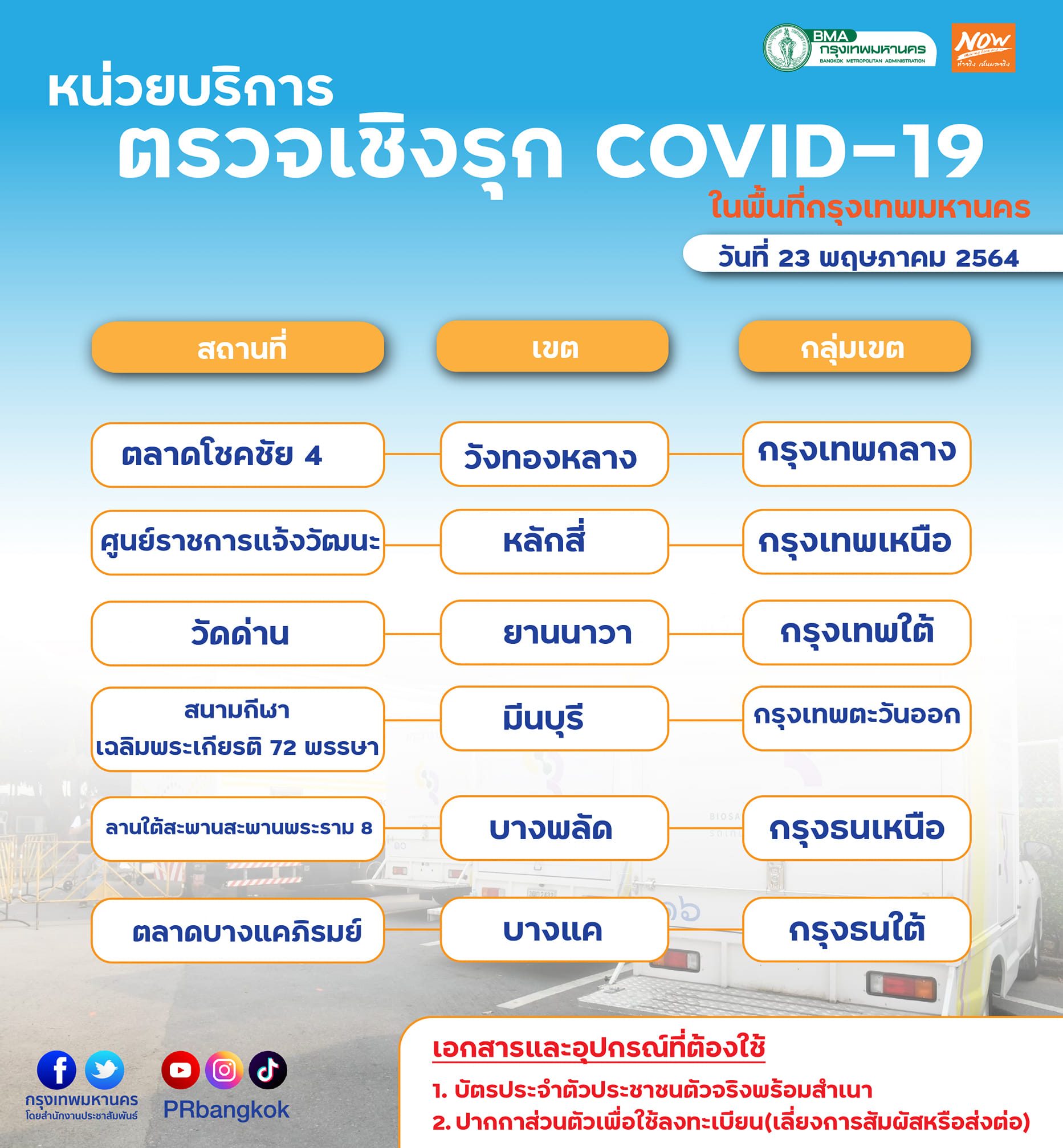 วันที่ 22 พ.ค. เพจกรุงเทพมหานคร โดยสำนักงานประชาสัมพันธ์ เผยแพร่หน่วยบริการตรวจเชิงรุกโควิด-19 ในพื้นที่กรุงเทพมหานคร วันที่ 23 พ.ค. 64 ตั้งแต่เวลา 08.00 น. เป็นต้นไป