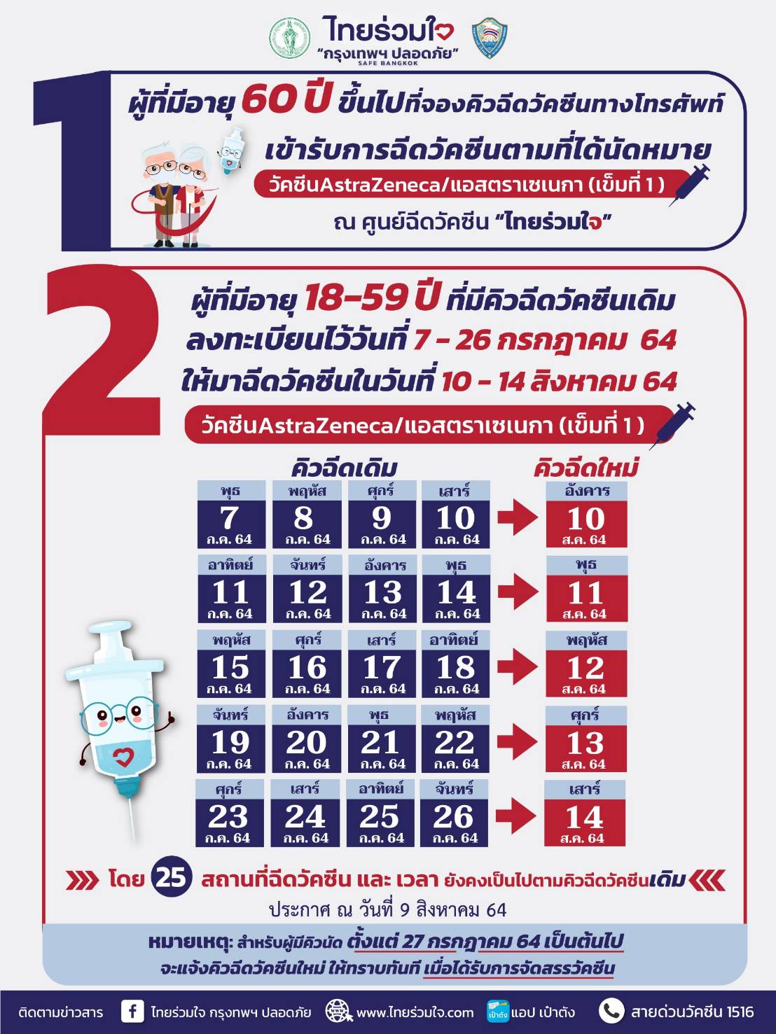วันที่ 9 สิงหาคม 2564 กรุงเทพมหานคร(กทม.) แจ้งผ่านเฟซบุ๊กว่า ไทยร่วมใจฯ แจ้งให้ผู้สูงอายุ 60 ปี ที่จองคิวฉีดวัคซีนทางโทรศัพท์ เข้ารับการฉีดวัคซีนตามที่ได้นัดหมาย พร้อมแจ้งคิวฉีดใหม่ ผู้ที่ถูกเลื่อนตั้งแต่ 7-26 ก.ค. 64 มาเป็น 10-14 ส.ค. 64