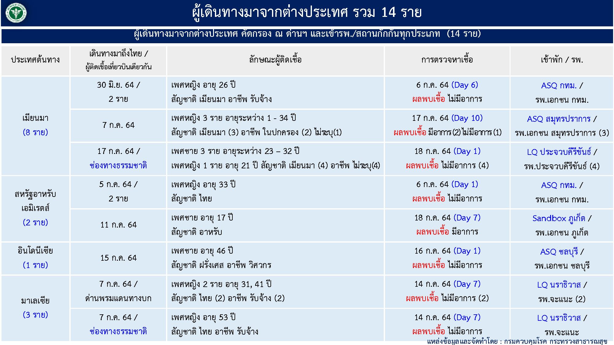 ส่วน ผู้ติดเชื้อที่เดินทางมาจากต่างประเทศ 14 ราย แบ่งเป็น เมียนมา 8 ราย, มาเลเซีย 3 ราย, สหรัฐอาหรับเอมิเรตส์ 2 ราย และ อินโดนีเซีย 1 ราย