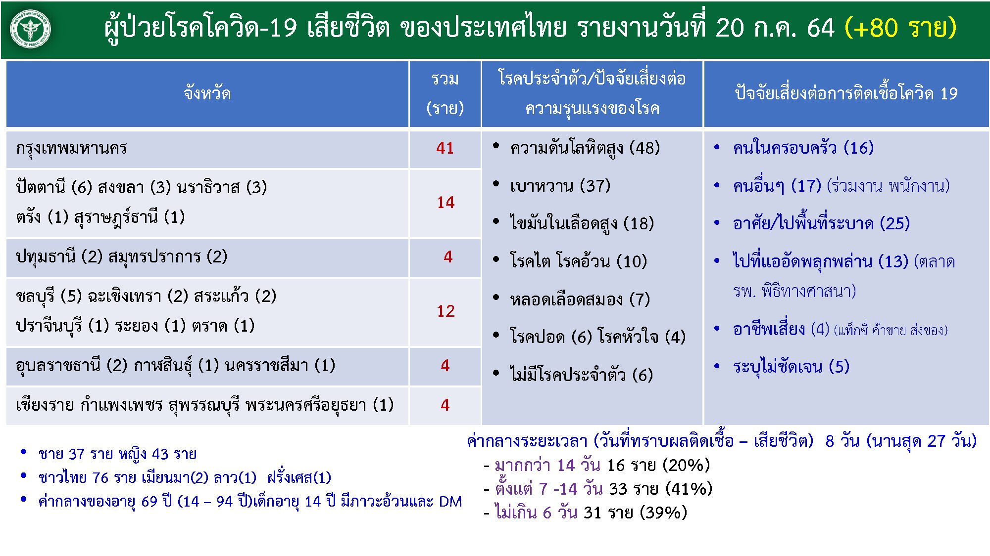 ยอดผู้เสียชีวิตวันนี้ 80 ราย แบ่งเป็น ชาย 37 ราย คน หญิง 43 ราย โดย กรุงเทพมหานครเสียชีวิตสูงสุด 41 ราย ปัตตานี 6 ราย, ชลบุรี 5 ราย, นราธิวาส และ สงขลา จังหวัดละ 3 ราย, ปทุมธานี สมุทรปราการ ฉะเชิงเทรา สระแก้วอุดรธานี จังหวัดละ 2 ราย, ตรัง สุราษฎร์ธานี ปราจีนบุรี ระยอง ตราด กาฬสินธุ์ นครราชสีมา เชียงราย กำแพงเพชร สุพรรณบุรี พระนครศรีอยุธยา จังหวัดละ 1 ราย