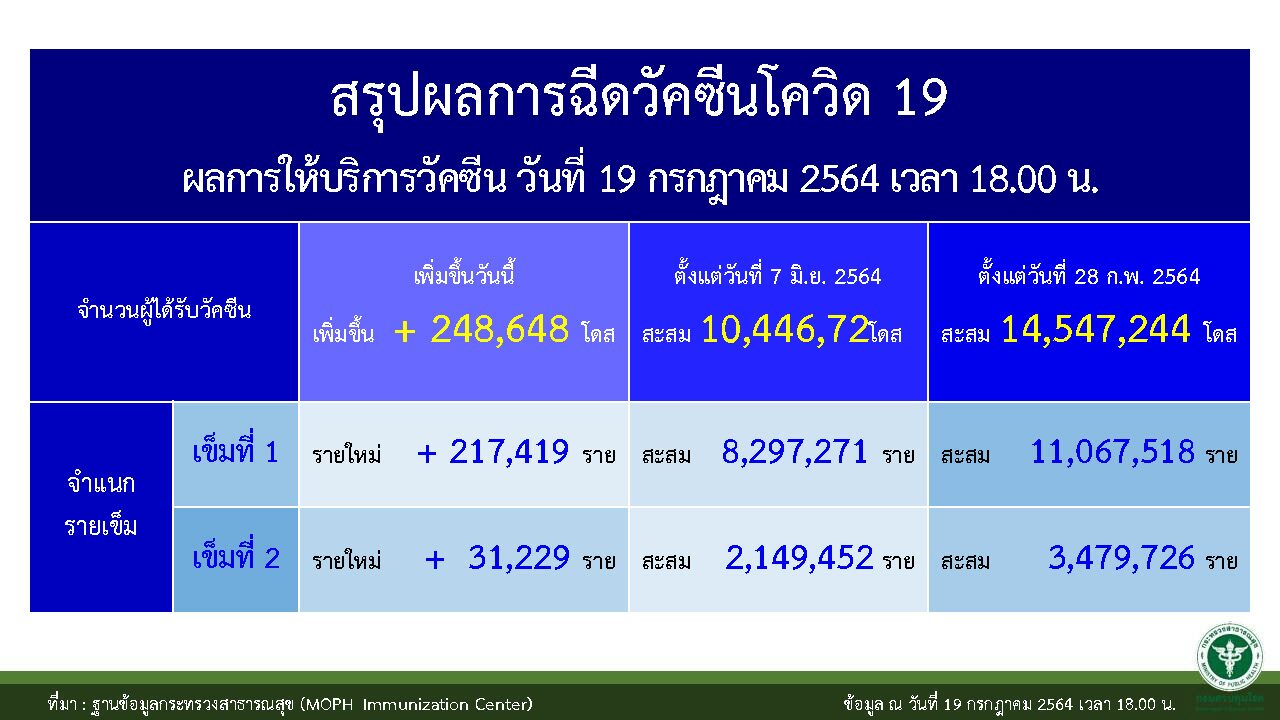 ยอดฉีดวัคซีนทั่วประเทศ ณ วันที่ 19 กรกฎาคม 2564 เวลา 18.00 น. จำนวน 248,648 โดส แบ่งเป็น