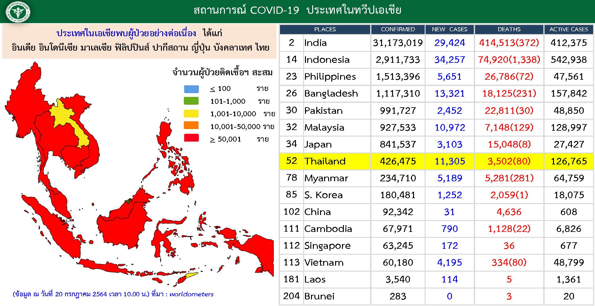 เมื่อเวลา 13.05 น.วันที่ 20 กรกฎาคม ผู้สื่อข่าวรายงานว่า ศูนย์บริหารสถานการณ์การแพร่ระบาดของโรคติดเชื้อไวรัสโคโรนา 2019 (โควิด-19) (ศบค.) รายงานสถานการณ์การแพร่ระบาดของโควิด-19 ในประเทศไทยว่า ยอดผู้ติดเชื้อของประเทศไทย อยู่ในอันดับที่ 52 ของโลก จำนวน 426,475 ราย