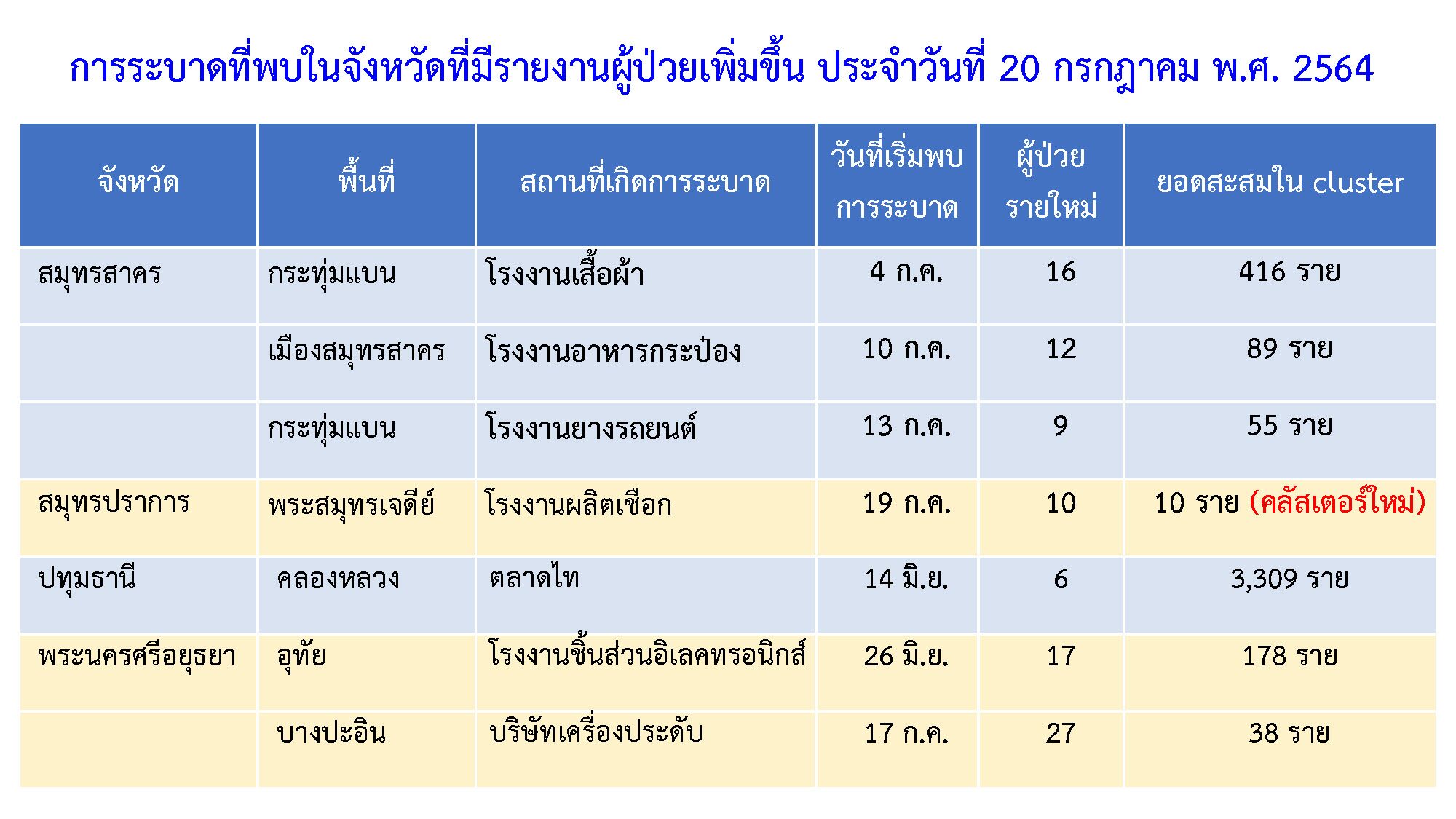 สำหรับ การระบาดในจังหวัดที่มีรายงานผู้ป่วยเพิ่มขึ้น พบ “คลัสเตอร์ใหม่” จำนวน 1 คลัสเตอร์ ได้แก่ จ.สมุทรสาคร โรงงานผลิตเชือก อ.พระสมุทรเจดีย์ พบผู้ติดเชื้อ 10 ราย