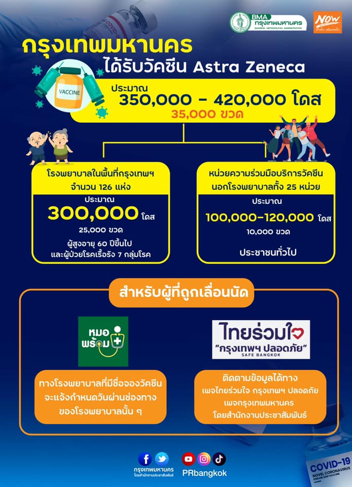 กรุงเทพมหานคร ได้รับการจัดสรรวัคซีนแอสตร้าเซนเนก้า 3.5-4.2 แสนโดส กระจายรพ.ในกทม. 126 แห่ง หน่วยบริการนอกรพ. 25 หน่วย เร่งฉีดให้ผู้ถูกเลื่อนนัด หมอพร้อม-ไทยร่วมใจ