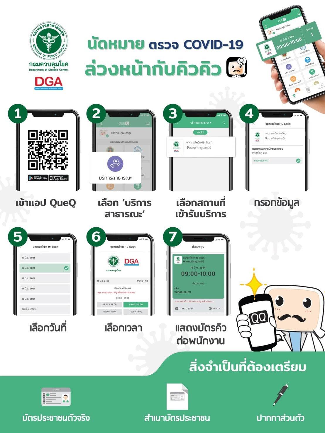 ทั้งนี้ กรมควบคุมโรค มอบหมายให้สถาบันป้องกันควบคุมโรคเขตเมือง ร่วมกับสำนักงานพัฒนารัฐบาลดิจิทัล (สพร.) พัฒนาแอปพลิเคชัน QueQ หรือ คิวคิว เป็นระบบลงทะเบียนออนไลน์ ให้ประชาชนที่มีความเสี่ยงใช้นัดหมายเข้ารับบริการตรวจโควิดล่วงหน้า 1 วัน