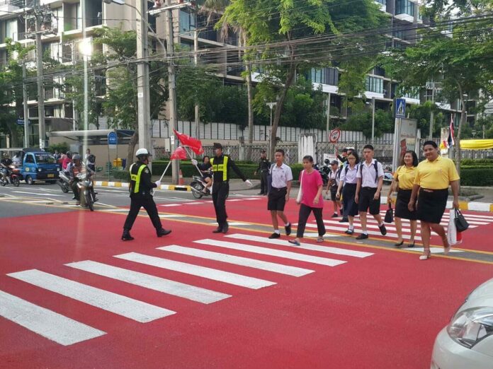 ด้วยการจัดทำเครื่องหมายทางข้าม โดยเฉพาะบริเวณทางข้ามหน้าโรงเรียน โรงพยาบาล และทางแยก ด้วยสีโคลด์พลาสติกสีแดง เพื่อให้มีความแตกต่างจากผิวการจราจรและเครื่องหมายจราจรโดยทั่วไป