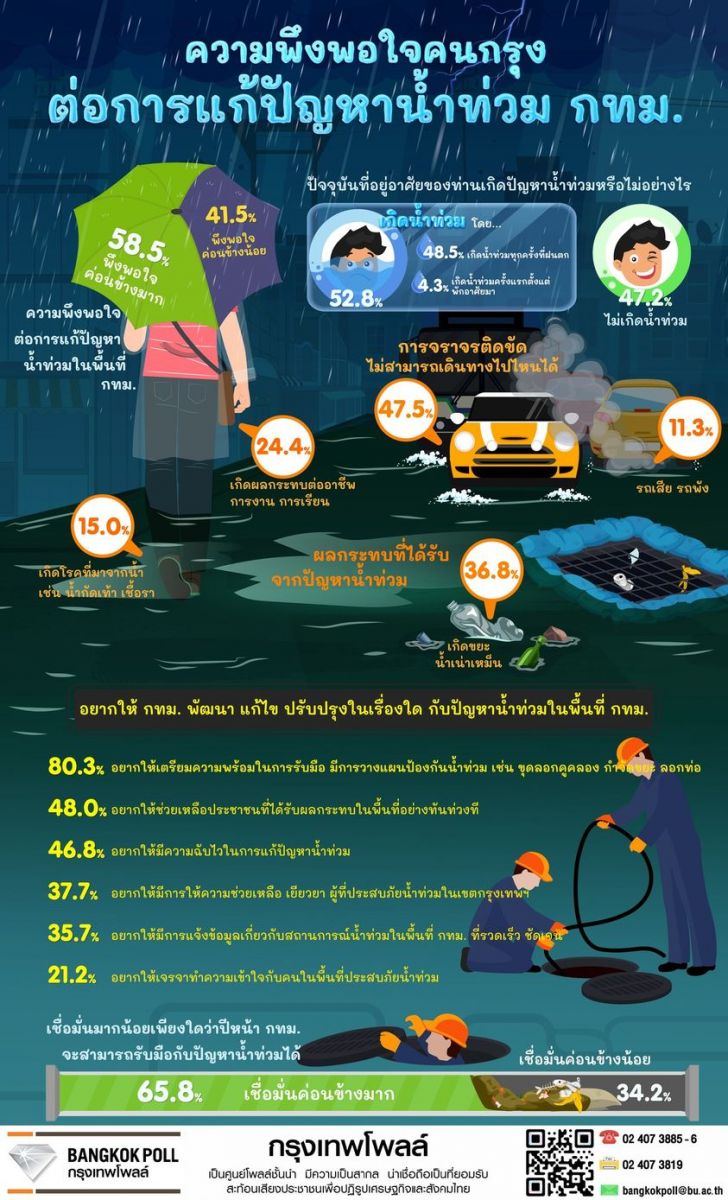 ด้านความพึงพอใจต่อการแก้ปัญหาน้ำท่วมในพื้นที่ กทม. พบว่า ส่วนใหญ่ร้อยละ 58.5 พึงพอใจค่อนข้างมากถึงมากที่สุด ขณะที่ร้อยละ 41.5 พึงพอใจค่อนข้างน้อยถึงน้อยที่สุด