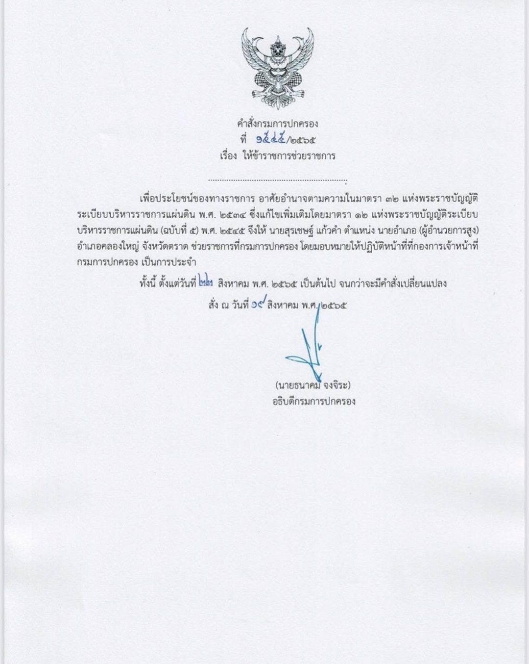 อย่างไรก็ตาม ในส่วนเรื่องที่เกี่ยวข้องกับกับนายอำเภอคลองใหญ่ ที่ถูกตำรวจกองปราบปรามจับกุมไปดำเนินคดีเมื่อเช้าวันนี้นั้น อธิบดีกรมการปกครอง ไม่ได้แจ้งให้ที่ประชุมทราบ และเจ้าหน้าที่ระดับอำนวยการที่เดินทางมาพร้อมกับอธิบดีกรมการปกครอง ไม่ต้องการให้ผู้สื่อข่าวได้สอบถามในประเด็นนี้ โดยอ้างว่าทางอธิบดีกรมการปกครอง ได้สั่งย้ายนายอำเภอคลองใหญ่ไปช่วยราชการที่กรมการปกครองแล้ว หลังจากได้รับรายงานข่าว ตามคำสั่งกรมการปกครองที่ 1555/2565 เรื่องให้ข้าราชการช่วยราชการ โดยระบุว่า “เพื่อประโยชน์ของทางราชการ อาศัยอำนาจตามความในมาตรา 32 แห่งพระราชบัญญัติ ระเบียบบริหารราชการแผ่นดิน พ.ศ. 2534 ซึ่งแก้ไขเพิ่มเติมโดยมาตรา 12 แห่งพระราชบัญญัติระเบียบ บริหารราชการแผ่นดิน (ฉบับที่ 5) พ.ศ. 2545 จึงให้นายสุรเชษฐ์ แก้วคำ ตำแหน่ง นายอำเภอ (ผู้อำนวยการสูง) อำเภอคลองใหญ่ จังหวัดตราด ช่วยราชการที่กรมการปกครอง โดยมอบหมายให้ปฏิบัติหน้าที่ที่กองการเจ้าหน้าที่กรมการปกครอง เป็นการประจำ ทั้งนี้ ตั้งแต่วันที่ 22 สิงหาคม พ.ศ. 2565 เป็นต้นไป จนกว่าจะมีคำสั่งเปลี่ยนแปลง สั่ง ณ วันที่ 19 สิงหาคม พ.ศ. 2565”
