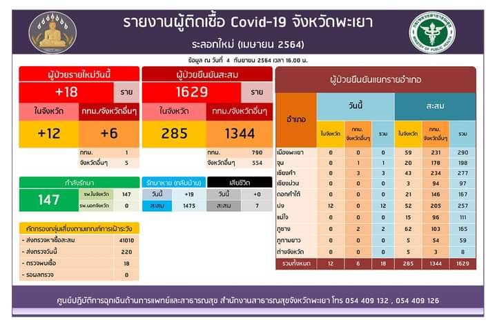 สำหรับผู้ติดเชื้อโควิด-19 ที่เดินทางมาจากกรุงเทพมหานครและต่างจังหวัดที่มาเข้ารับการรักษาที่โรงพยาบาลในจังหวัดพะเยา ผ่านศูนย์ประสานงานรับคนพะเยากลับบ้าน ในวันนี้มีจำนวน 6 ราย (อยุธยา 2 ราย กรุงเทพมหานคร 1 ราย ปทุมธานี 1 ราย ชลบุรี 1 รายและเชียงราย 1 ราย) รวมผู้ติดเชื้อสะสมระลอกใหม่เดือนเมษายน จำนวนทั้งสิ้น 1,629 ราย วันนี้มีผู้ป่วยกลับบ้านเพิ่ม 19 ราย รวมกลับบ้านแล้ว 1,475 ราย ยังคงรักษาตัวอยู่ในโรงพยาบาล 147 ราย มีผู้เสียชีวิตสะสม จำนวน 7 ราย