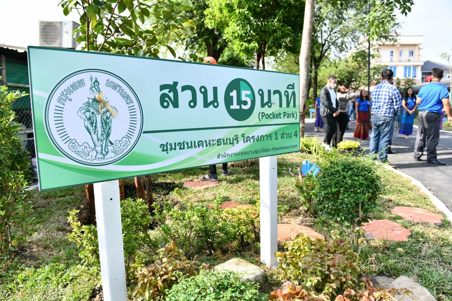 สำหรับสวน 15 นาที (Pocket Park) บริเวณชุมชนการเคหะธนบุรีโครงการ 1 ส่วน 4 เป็นที่ดินสาธารณะ พื้นที่ 1 งาน 50 ตารางวา ด้านหน้ากว้าง 16 เมตร ลึก 40 เมตร เป็นการประสานความร่วมมือระหว่างชุมชนการเคหะธนบุรีโครงการ 1 ส่วน 4 และสำนักงานเขตบางขุนเทียน ในการพัฒนาพื้นที่ว่างให้เกิดประโยชน์ เพิ่มพื้นที่สีเขียว เป็นกำแพงกรองฝุ่น โดยจัดทำสวน 15 นาที ในรูปแบบสวนหย่อมขนาดเล็ก (Pocket Park) เพื่อความเป็นระเบียบเรียบร้อย มีความร่มรื่นสวยงาม เป็นพื้นที่สาธารณะให้ประชาชนเข้ามาใช้บริการออกกำลังกายและพักผ่อนหย่อนใจ โดยดำเนินการรักษาต้นไม้ยืนต้นเดิมไว้ ปรับปรุงเพิ่มเติมไม้พุ่ม ไม้ดอก ไม้ประดับที่จะคงสภาพเดิมไว้พร้อมปลูกไม้พุ่มที่มีความแข็งแรง กิ่งก้านเหนียวไม่หักง่าย หรือมีใบละเอียด เช่น ไทรเกาหลี เข็ม หมากเหลือง จั๋ง ยี่โถ จัดทำทางเดินโดยรอบและภายในสวน โดยใช้กากยางปูและเทแอสฟัลต์ จัดหาม้านั่งสนามภายในบริเวณสวน เพิ่มไฟฟ้าและแสงสว่าง โดยประสานชุมชนและภาคเอกชนเข้ามามีส่วนร่วมในการจัดการ ขอสนับสนุนไฟฟ้าโซล่าเซลล์จากภาคเอกชน เพื่อเพิ่มแสงสว่างภายในสวน