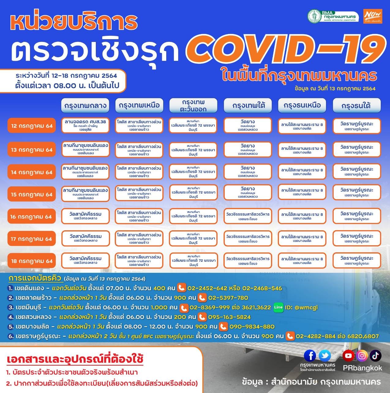 วันที่ 13 กรกฎาคม 2564 สำนักงานประชาสัมพันธ์ กรุงเทพมหานคร แจ้งพิกัดหน่วยบริการตรวจเชิงรุกโควิด-19 ในพื้นที่กรุงเทพมหานคร วันที่ 12 – 18 กรกฎาคม 2564 ตั้งแต่เวลา 08.00 น.เป็นต้นไป มีทั้งหมด 6 สถานที่ ต่อวัน ดังนี้
