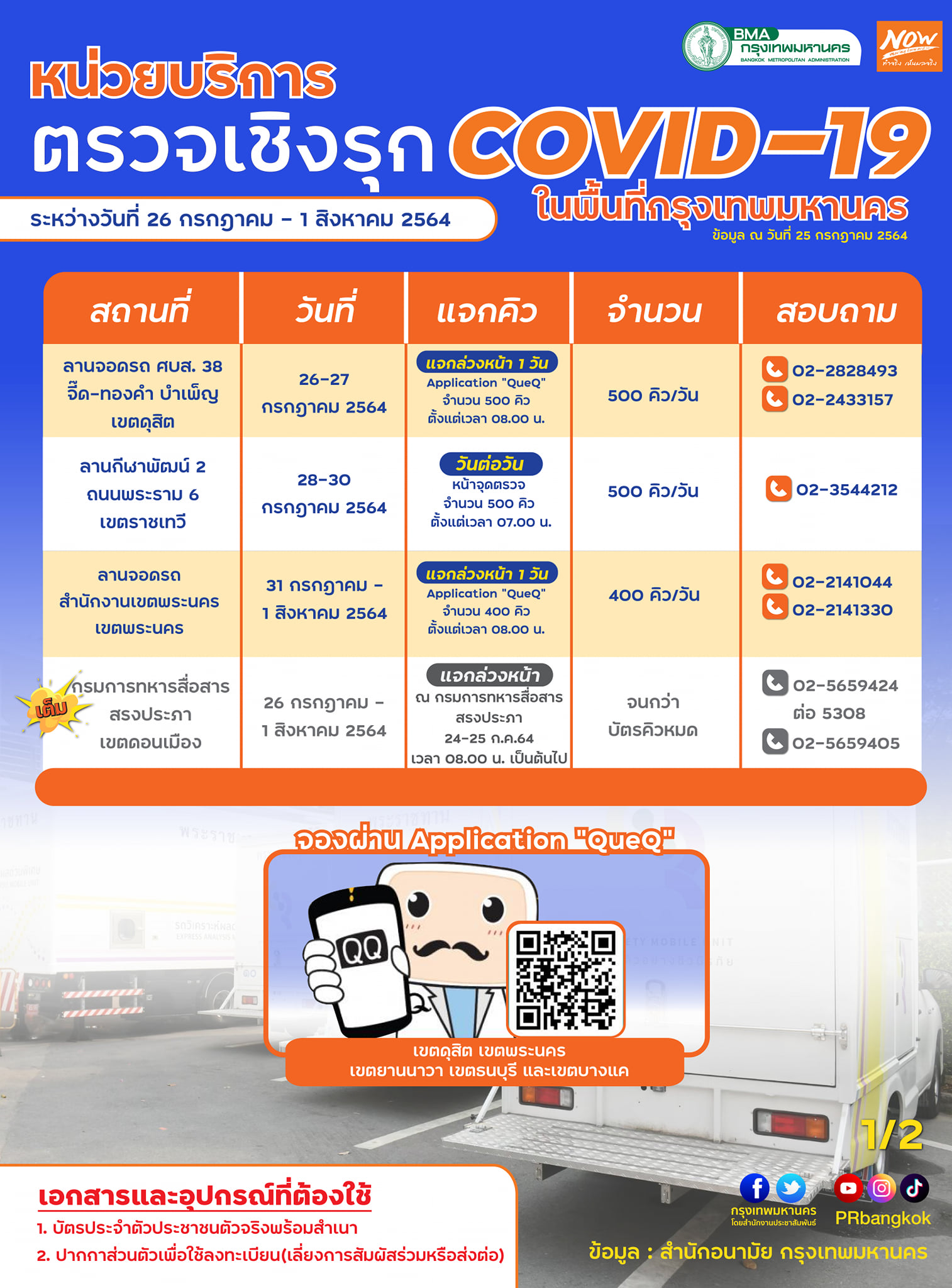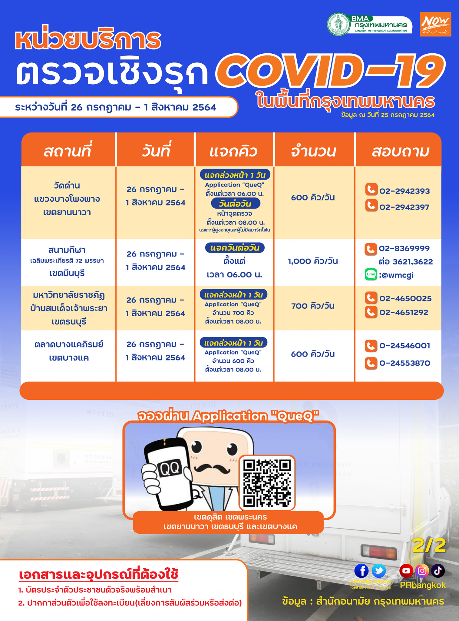 วันที่ 25 กรกฎาคม 2564 สำนักงานประชาสัมพันธ์ กรุงเทพมหานคร แจ้งรายละเอียดหน่วยบริการตรวจเชิงรุกโควิด-19 ในพื้นที่กรุงเทพมหานคร ระหว่างวันที่ 26 กรกฎาคม ถึง 1 สิงหาคม 2564 โดยมีการระบุรายละเอียดสถานที่ทั้ง 8 แห่ง รวมถึงวันแจกคิวล่วงหน้า และเบอร์ติดต่อ ดังนี้