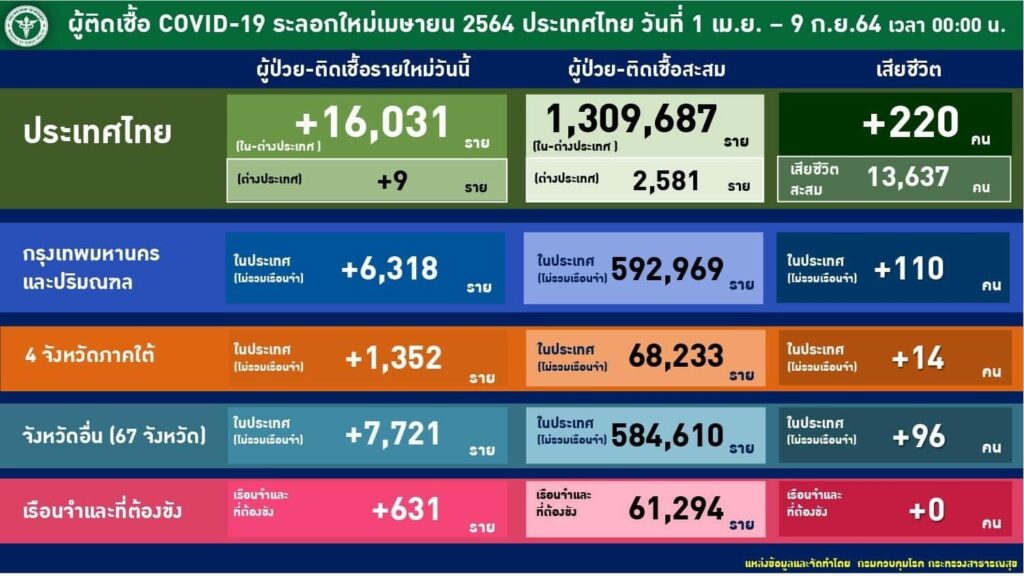 สำหรับสถานการณ์ในประเทศ มีติดเชื้อเพิ่ม 16,031 ราย อยู่ในพื้นที่กรุงเทพฯและปริมณฑล 6,318 ราย พื้นที่ 4 จังหวัดภาคใต้ 1,352 ราย จังหวัดอื่นรวม 67 จังหวัด 7,721 ราย เรือนจำและห้องขัง 631 รายและจากต่างประเทศ 9 ราย