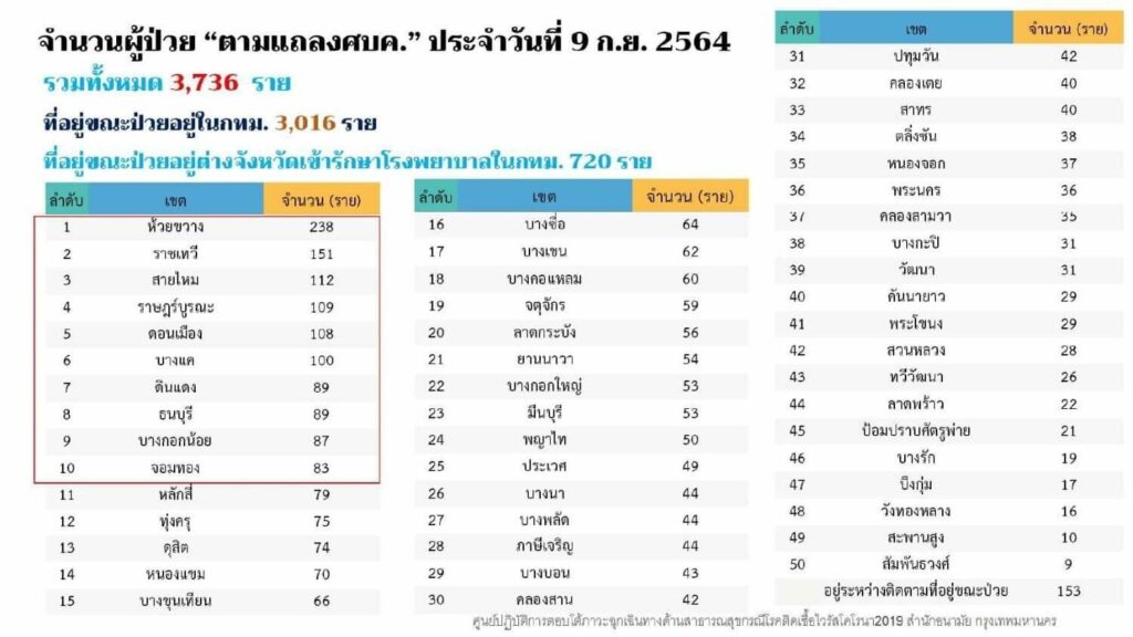 เมื่อลงรายละเอียดการติดเชื้อใหม่ในพื้นที่กรุงเทพฯ จำนวน 3,736 ราย แยกเป็นอยู่ใน กทม. 3,016 ราย และอยู่ต่างจังหวัดเข้ารักษาโรงพยาบาลใน กทม. 720 ราย