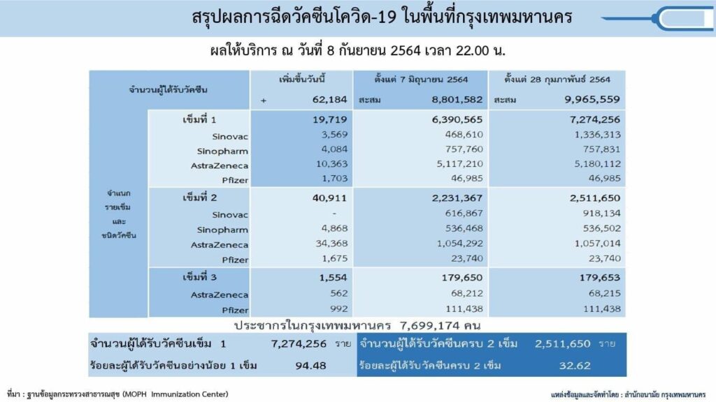 ทำให้ยอดการฉีดวัคซีนสะสมตั้งแต่วันที่ 28 กุมภาพันธ์-8 กันยายน 2564 อยู่ที่ 38,174,738 โดส แยกเป็นเข็มที่ 1 จำนวน 26,292,211 ราย คิดเป็น 36.5% เข็มที่ 2 จำนวน 11,272,593 ราย คิดเป็น 15.6% และเข็มที่ 3 จำนวน 609,943 ราย