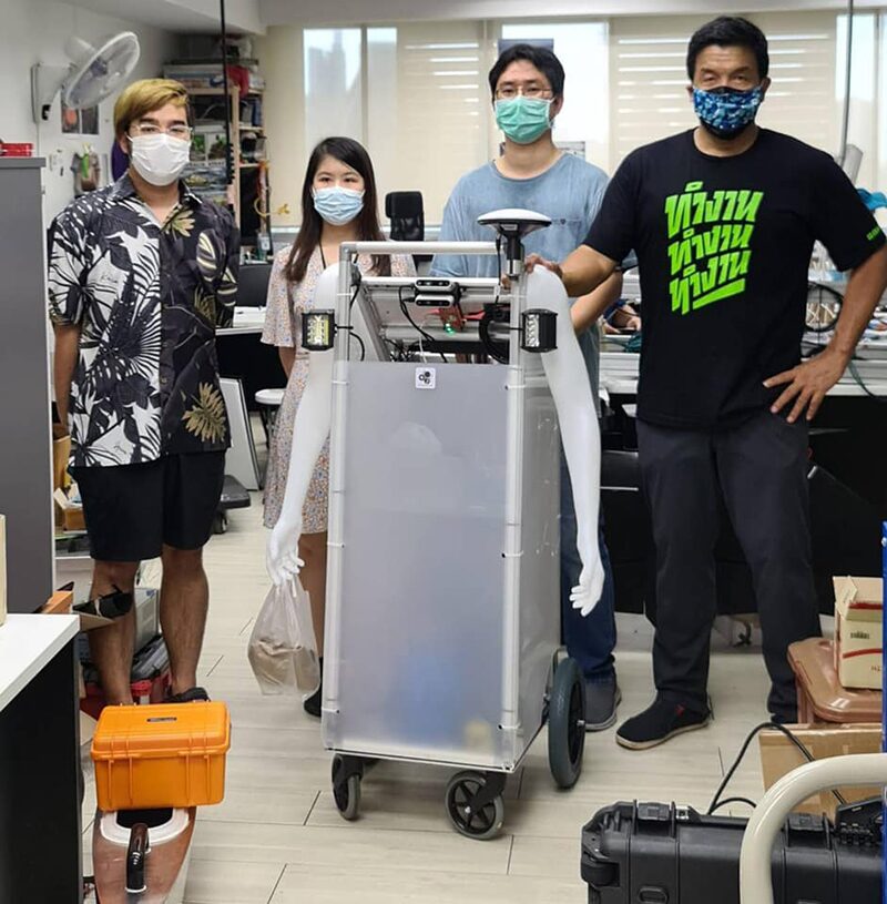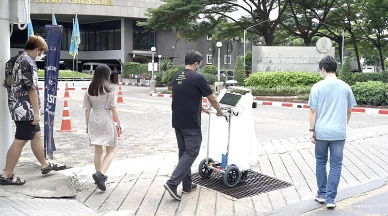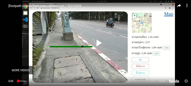 “เราได้มีการทำงานร่วมกับน้องๆ Startup บริษัท HiveGround ที่เชี่ยวชาญด้านโดรนและหุ่นยนต์ พัฒนาหุ่นยนต์ต้นแบบ ที่ใช้สำรวจทางเท้า โดยเป็นรถเข็นที่ติดตั้งกล้องวิดีโอสำหรับตรวจสภาพสามมิติ เครื่องวัดพิกัด GPS เครื่องวัดความลาดเอียง วัดความเร่ง คอมพิวเตอร์และจอประมวลผล แบตเตอรี่”