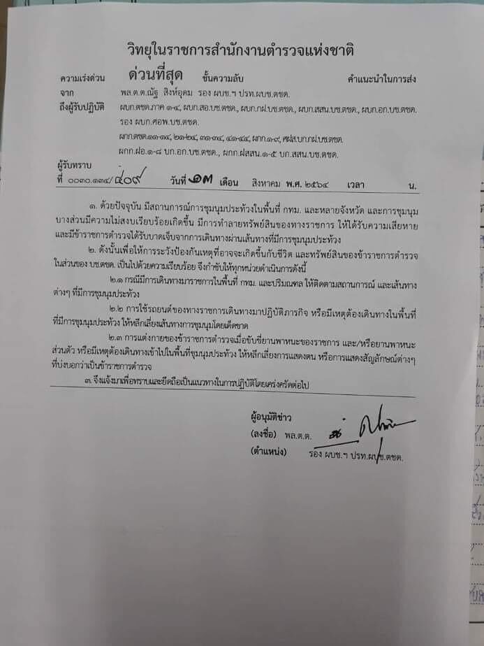 ระบุว่า ด้วยปัจจุบันมีสถานการณ์การชุมนุมประท้วงในพื้นที่กรุงเทพมหานคร และหลายจังหวัด และการชุมนุมบางส่วนมีความไม่สงบเรียบร้อยเกิดขึ้น มีการทำลายทรัพย์สินของทางราชการให้ได้รับความเสียหาย และมีข้าราชการตำรวจได้รับบาดเจ็บจากการเดินทางผ่านเส้นทางที่มีการชุมนุมประท้วง