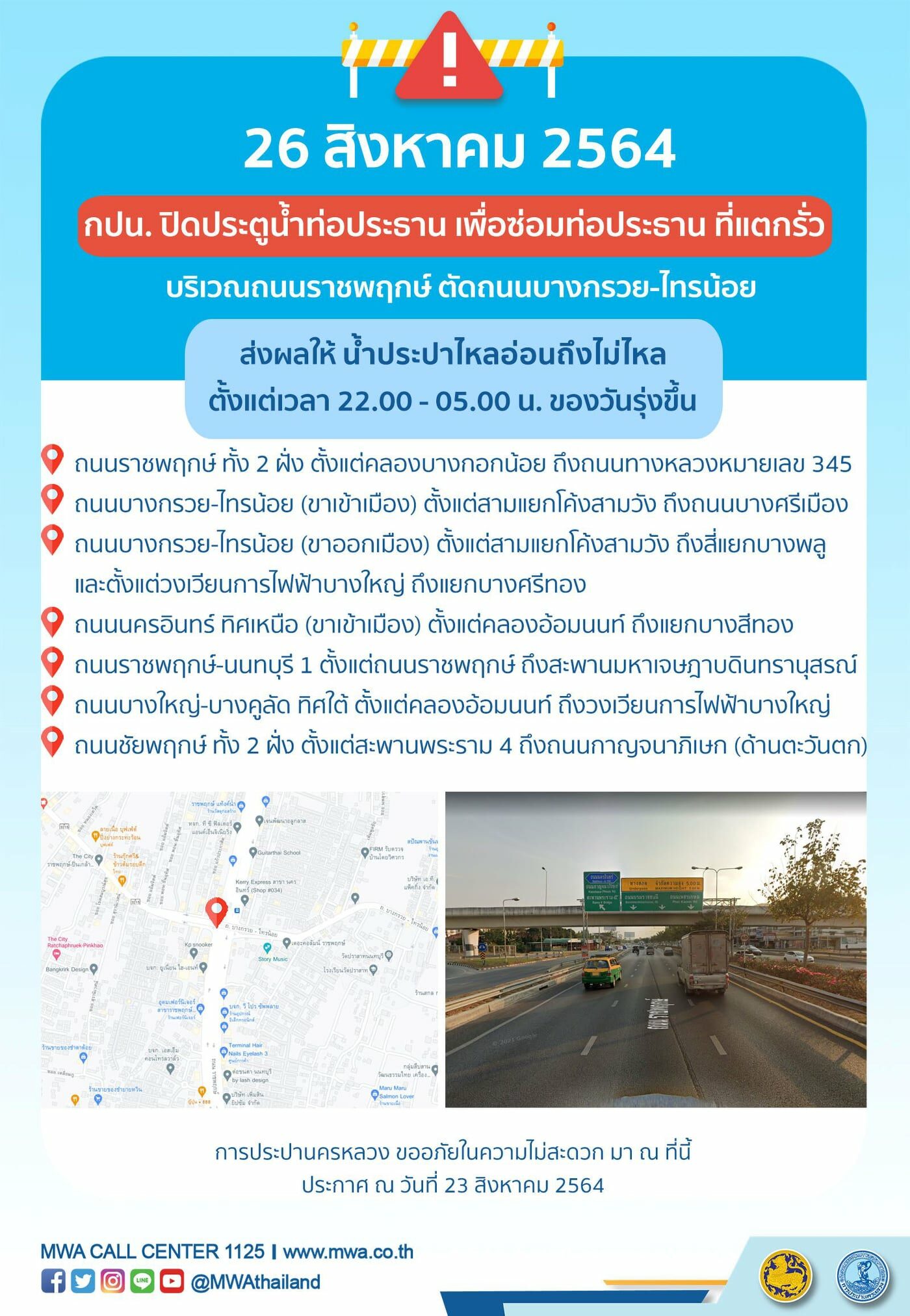 สำหรับวันที่ 26 สิงหาคม 2564 กปน. ซ่อมท่อประธาน ที่แตกรั่ว บริเวณถนนราชพฤกษ์ ตัดถนนบางกรวย-ไทรน้อย ในคืนวันพฤหัสบดีที่ 26 สิงหาคม 2564 ตั้งแต่เวลา 22.00 – 05.00 น. ของวันรุ่งขึ้น ทำให้น้ำประปาไหลอ่อนถึงไม่ไหลในพื้นที่ ดังต่อไปนี้