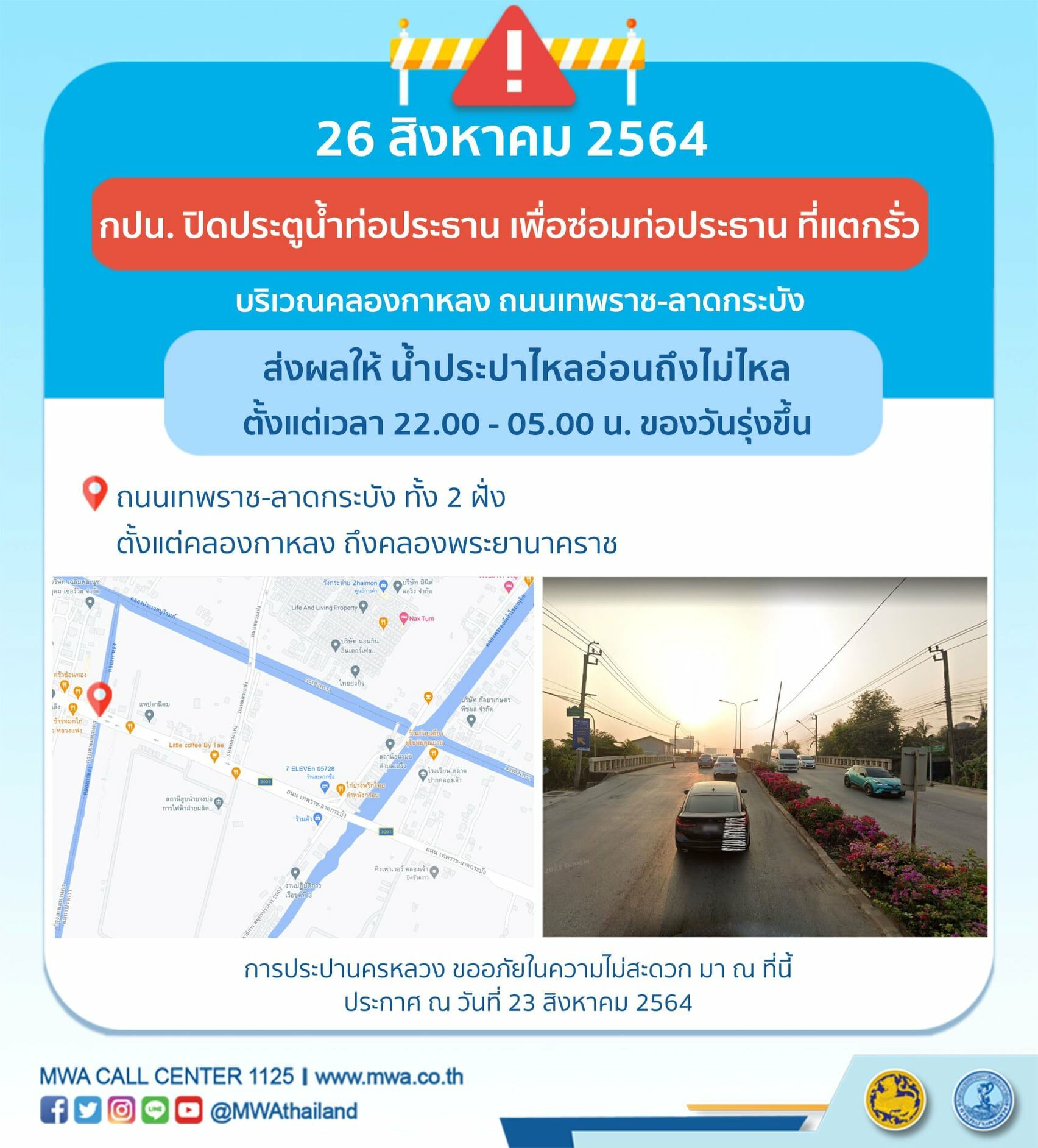 วันที่ 24 สิงหาคม 2564 ผู้สื่อข่าวรายงานว่า การประปานครหลวง (กปน.) ประกาศแจ้งซ่อมท่อประธาน ที่แตกรั่ว ในวันที่ 25 สิงหาคม 2564 และ วันที่ 26 สิงหาคม 2564 ส่งผลให้น้ำประปาไหลอ่อนถึงไม่ไหลชั่วคราวในหลายพื้นที่ทั้งกรุงเทพมหานคร และปริมณฑล ดังนี้