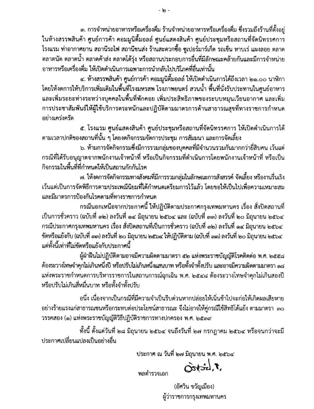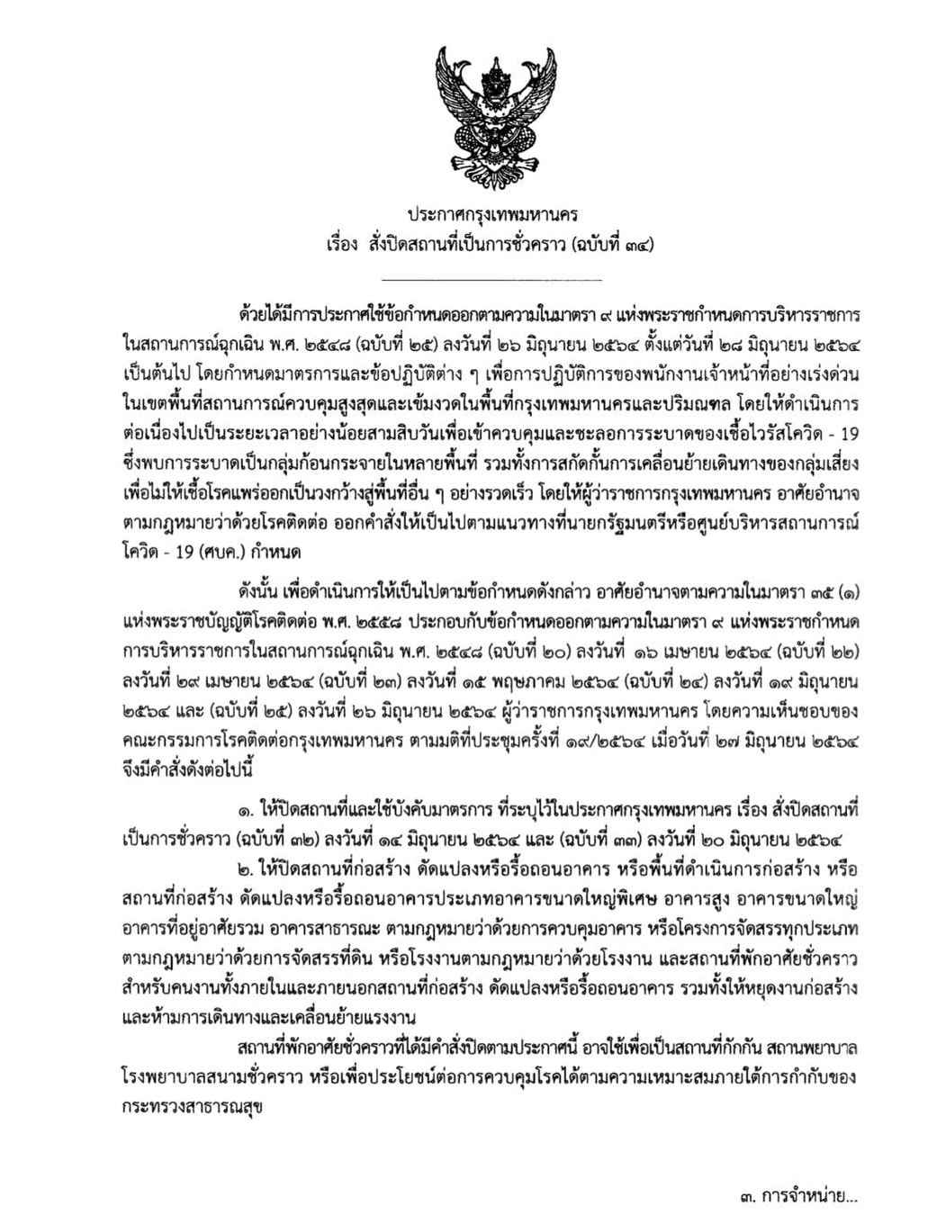 วันที่ 27 มิถุนายน 2564 ฝ่ายประชาสัมพันธ์ กรุงเทพมหานคร (กทม.) แจ้งว่า พล.ต.อ.อัศวิน ขวัญเมือง ผู้ว่าราชการ กทม. ได้ลงนามประกาศ กทม.ฉบับที่ 34 ลงวันที่ 27 มิถุนายน 2564 โดยมีมาตรการสำคัญ 5 เรื่อง