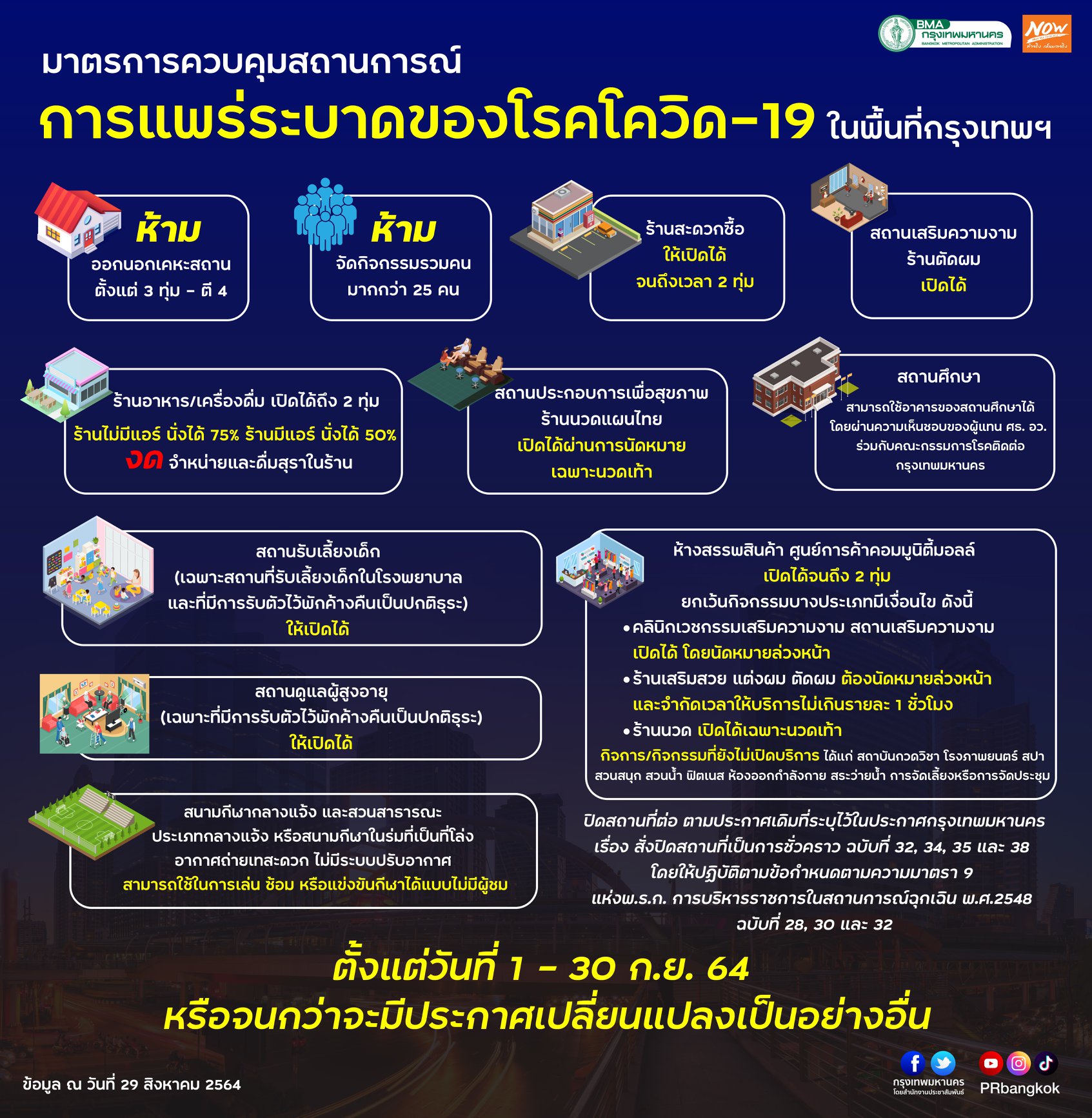 ผู้สื่อข่าวรายงานว่า เมื่อวันที่ 29 สิงหาคม 2564 คณะกรรมการควบคุมโรคติดต่อกรุงเทพมหานคร มีมติเห็นชอบปรับมาตรการตามข้อกำหนดเพื่อให้กิจการ/กิจกรรม สามารถเปิดดำเนินการได้โดยต้องปฏิบัติตามเงื่อนไข เงื่อนเวลา การจัดระบบ ระเบียบ และมาตรการป้องกันโรคที่ทางราชการกำหนด รวมทั้งมาตรการตามกฎหมายว่าด้วยโรคติดต่อที่มีผู้มีหน้าที่รับผิดชอบกำหนดขึ้นเป็นการเฉพาะ