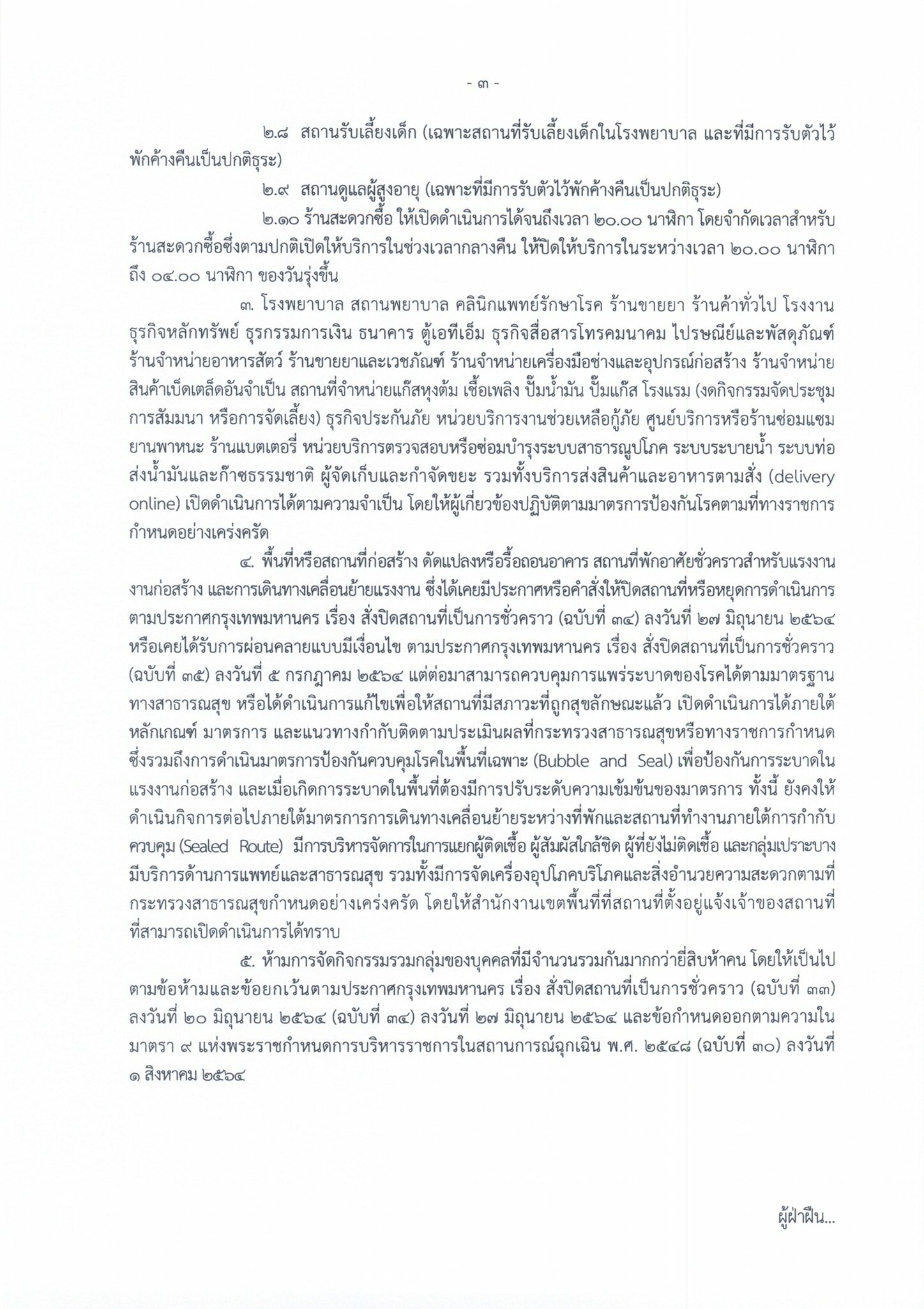 3. ร้านอาหารหรือเครื่องดื่มเปิดให้บริการได้ ไม่เกิน 20.00 น. โดยร้านอาหารที่อยู่นอกอาคาร หรือในอาคาร แต่ไม่มีเครื่องปรับอากาศ ให้นั่งรับประทานได้ 75 % ส่วนร้านอาหารที่มีเครื่องปรับอากาศ ให้นั่งรับประทานได้ 50 %