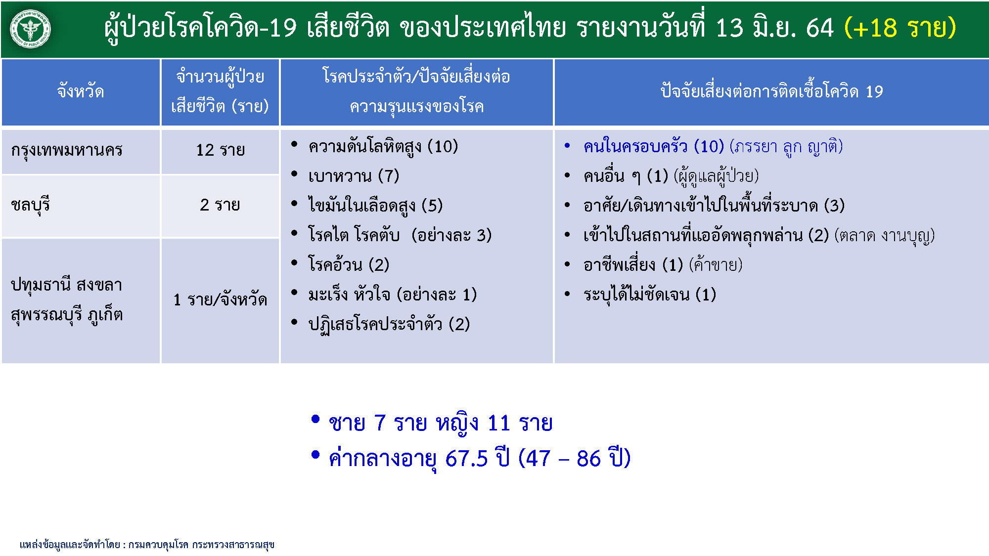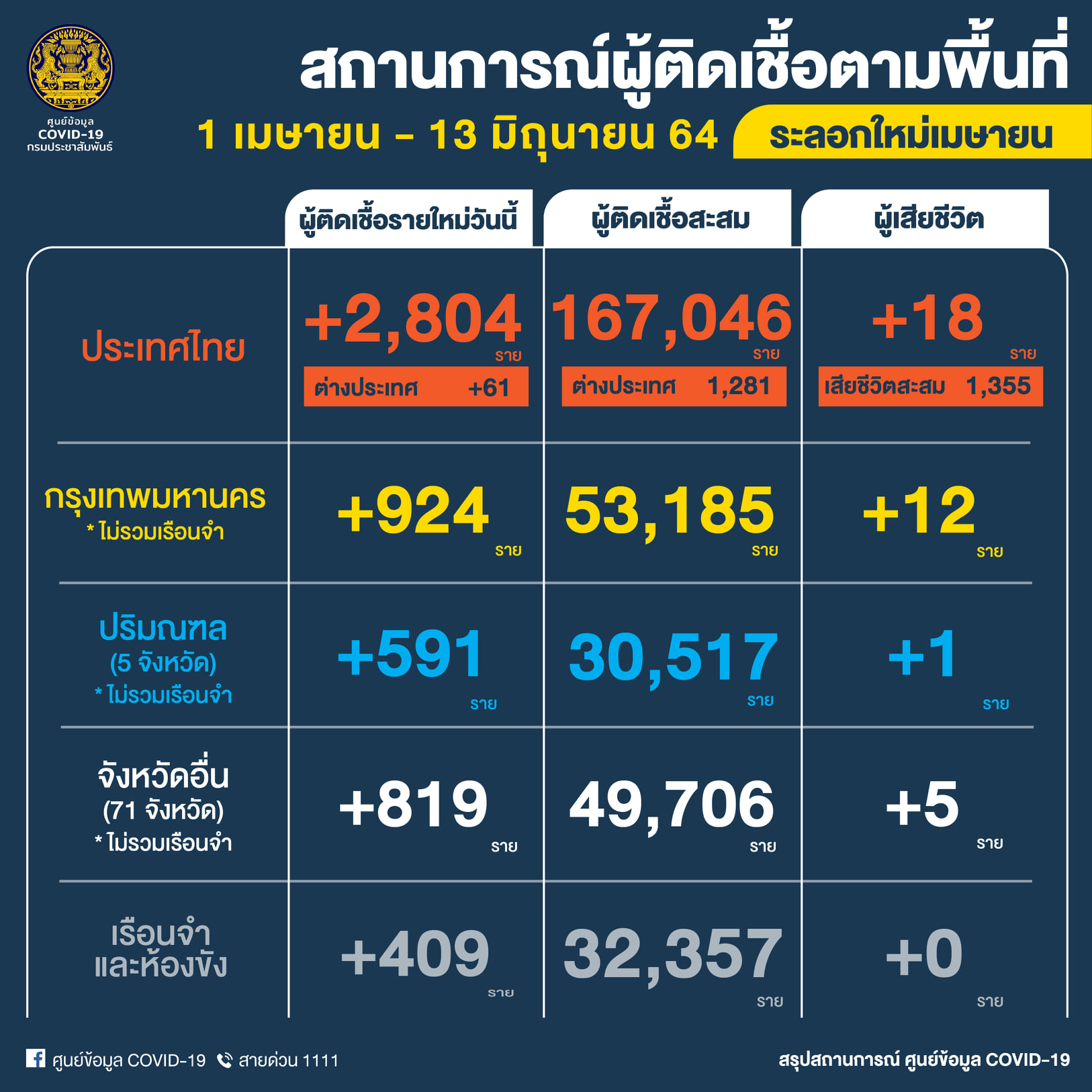 ผู้ติดเชื้อรายใหม่ทั้ง 2,804 ราย แบ่งตามพื้นที่ที่พบผู้ติดเชื้อ (ข้อมูลวันที่ 1 เมษายน – 13 มิถุนายน) กรุงเทพมหานคร 924 ราย ป่วยสะสม 53,185 ราย เสียชีวิตเพิ่ม 12 ราย พื้นที่ปริมณฑล 591 ราย ป่วยสะสม 30,517 ราย เสียชีวิตเพิ่ม 1 ราย จังหวัดอื่น ๆ (71 จังหวัด ไม่รวมเรือนจำ) 819 ราย ป่วยสะสม 49,706 ราย เสียชีวิตเพิ่ม 5 ราย และผู้ติดเชื้อในเรือนจำและห้องขังเพิ่ม 409 ราย ป่วยสะสม 32,357 ราย ไม่มีผู้เสียชีวิต