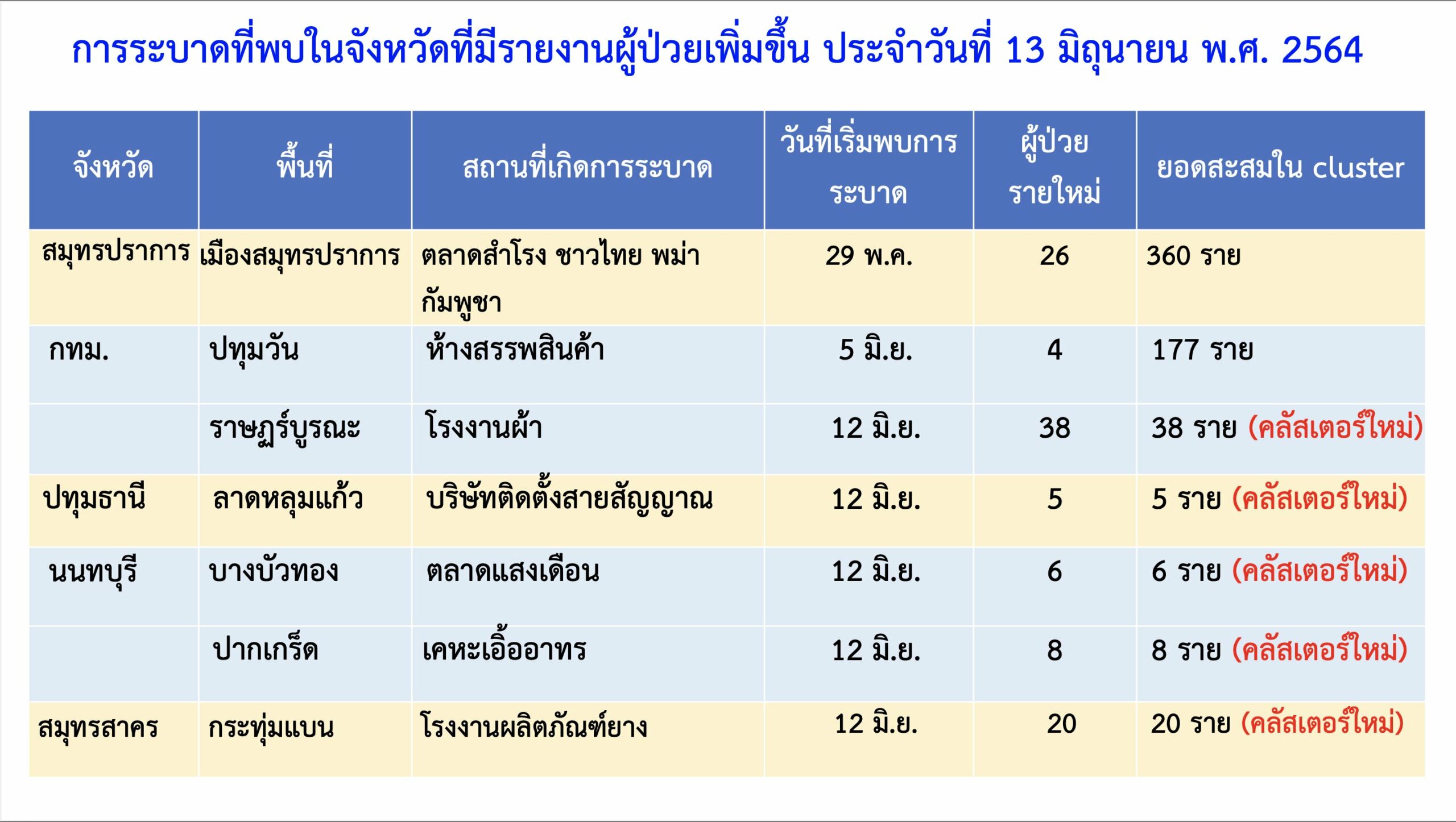 การรายงานข้อมูลการระบาดของโรคโควิด-19 ที่พบในจังหวัดที่มีรายงานผู้ป่วยเพิ่มขึ้น วันนี้ (13 มิ.ย.) ระบุว่า พบคลัสเตอร์ใหม่ จากสถานที่เกิดการระบาด ดังนี้
