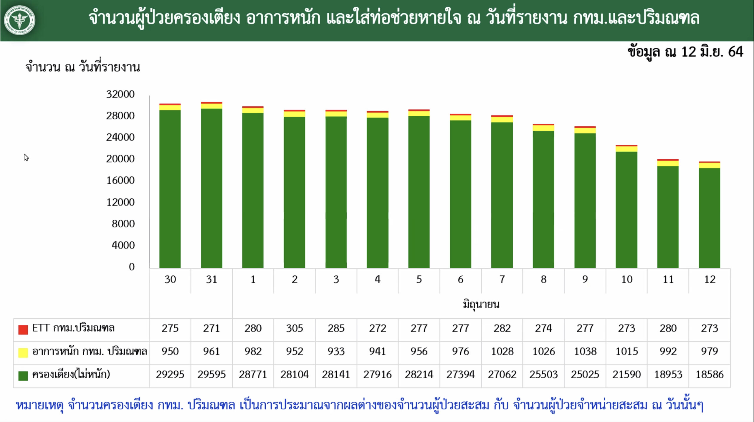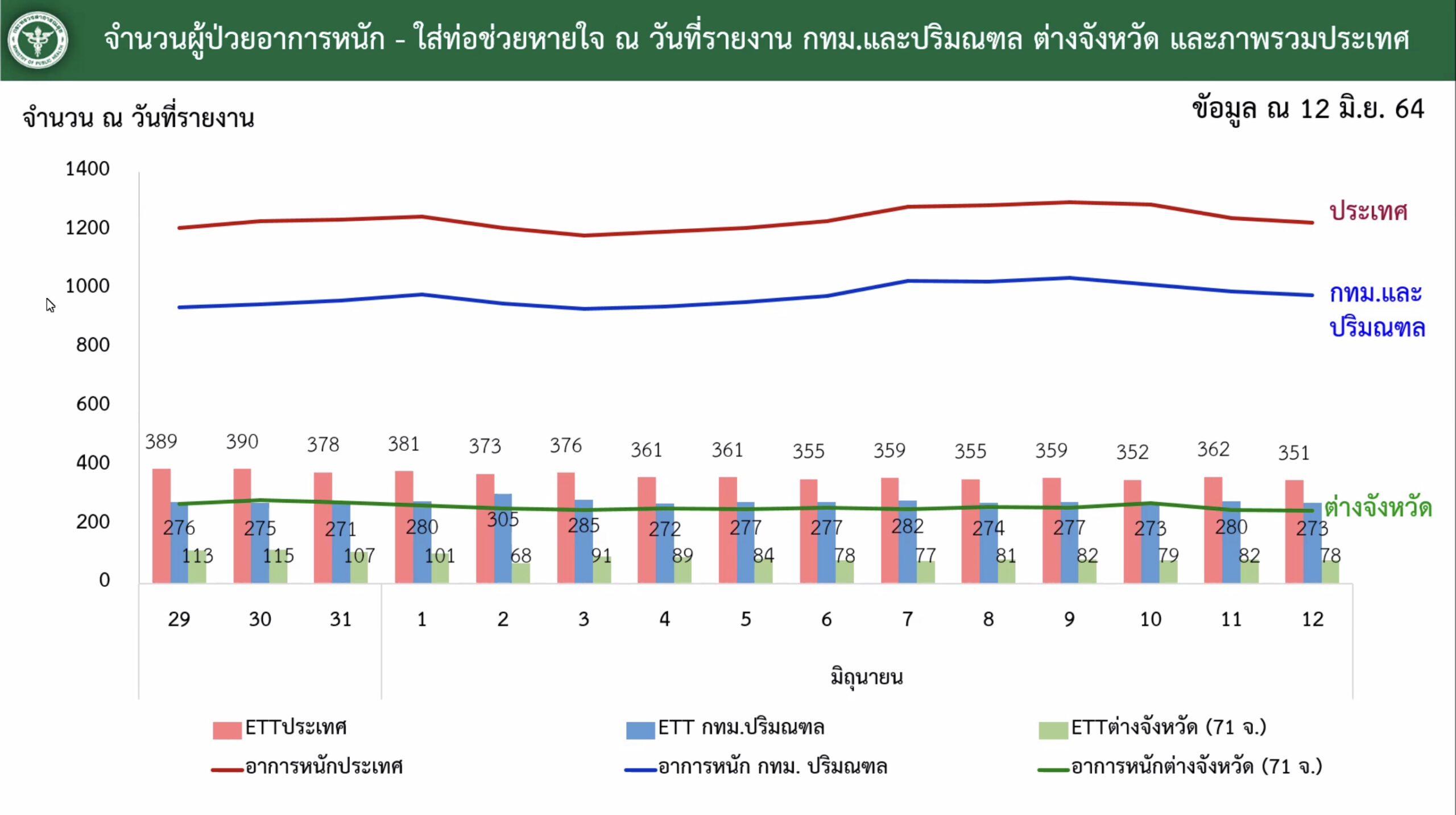 รายงานข้อมูลของจำนวนผู้ป่วยอาการหนัก และใส่ท่อช่วยหายใจ ภาพรวมของประเทศยังทรงตัว ข้อมูลล่าสุดอยู่ที่ 351 ราย ในกรุงเทพมหานคร และปริมณฑล อยู่ที่ 273 ราย และต่างจังหวัดลดลงเหลือ 78 ราย