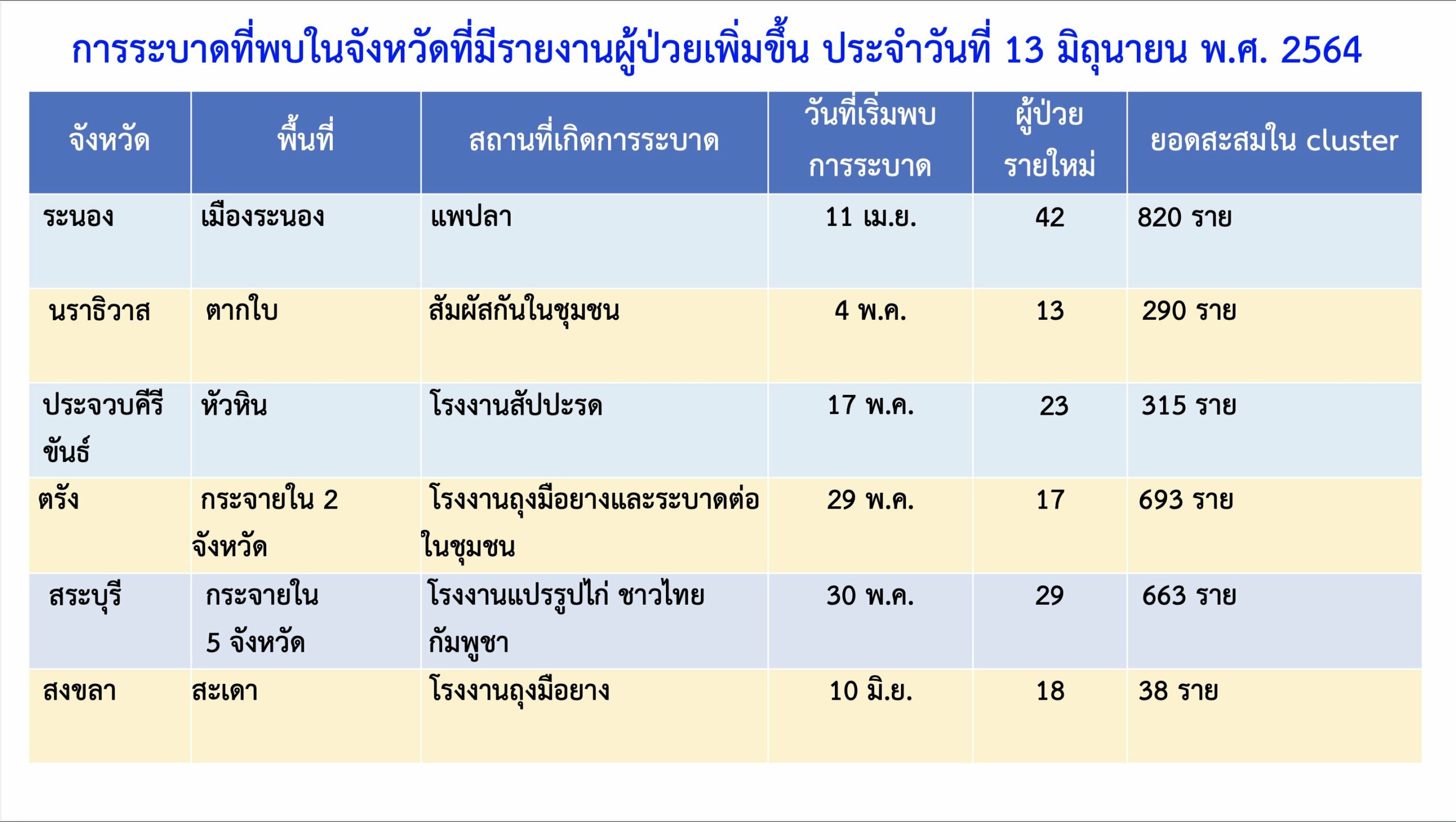 การรายงานข้อมูลการระบาดของโรคโควิด-19 ที่พบในจังหวัดที่มีรายงานผู้ป่วยเพิ่มขึ้น วันนี้ (13 มิ.ย.) ระบุว่า พบคลัสเตอร์ใหม่ จากสถานที่เกิดการระบาด ดังนี้