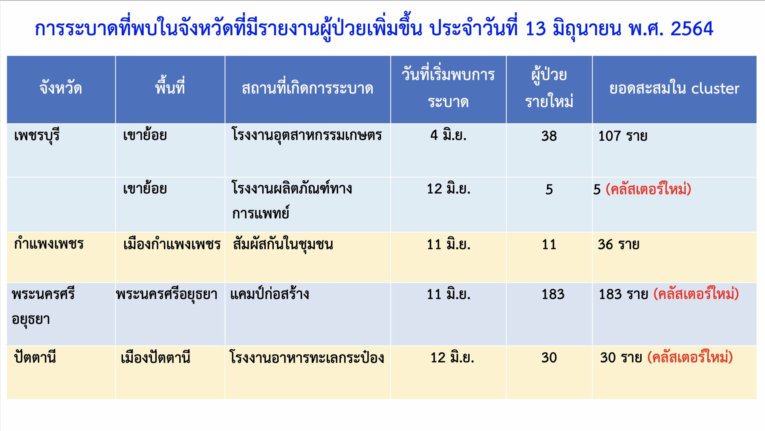 - เพชรบุรี : อำเภอเขาย้อย โรงงานผลิตภัณฑ์ทางการแพทย์ 5 ราย (12 มิ.ย.)