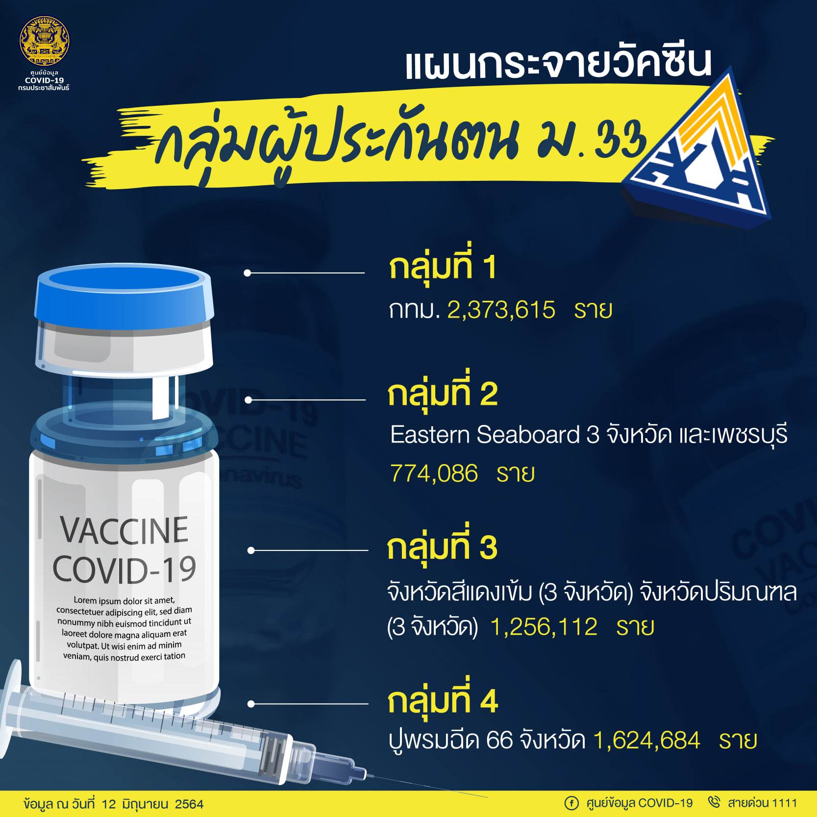 วันที่ 12 มิถุนายน 2564 ศูนย์บริหารสถานการณ์โควิด-19(ศบค.) จัดทำ infographic สรุป แผนกระจายวัคซีน กลุ่มผู้ประกันตน ม.33 ของประกันสังคม ดังนี้