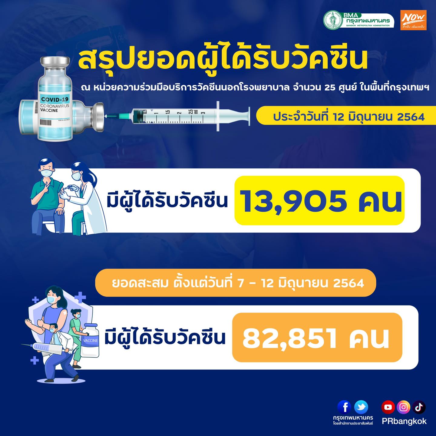 ทางด้านกรุงเทพมหานคร(กทม.) สรุปยอดผู้ได้รับวัคซีนล่าสุด ณ หน่วยความร่วมมือบริการวัคซีนนอกโรงพยาบาล 25 ศูนย์ ในพื้นที่กรุงเทพมหานคร ประจำวันที่ 12 มิ.ย 64 มีผู้ได้รับวัคซีน จำนวน 13,905 คน รวมสะสม (7 – 12 มิ.ย. 64) มีผู้ได้รับวัคซีน จำนวน 82,851 คน
