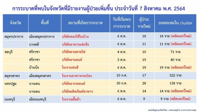 สำหรับคลัสเตอร์ใหม่วันนี้ ได้แก่ 1.สมุทรปราการ คลัสเตอร์ ได้แก่ บริษัทของใช้ในบ้าน อ.เมือง 18 ราย และบริษัทอาหารแช่แข็ง อ.บางพลี 11 ราย 2.ชลบุรี โรงงานพ่นสี อ.บ้านบึง 19 ราย 3.นครปฐม บริษัทผลิตภัณฑ์อาหาร อ.บางเลน 14 ราย และ 4.นนทบุรี โรงงานเสื้อผ้า อ.เมือง 9 ราย