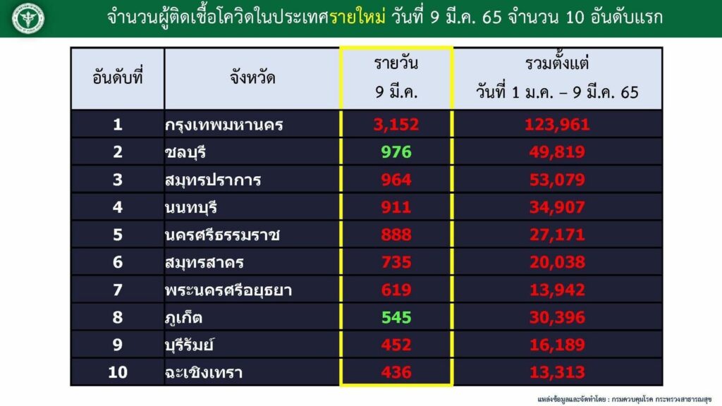 แพทย์หญิงสุมณี กล่าวว่า สำหรับจำนวนผู้ป่วยติดเชื้อโควิดในประเทศรายใหม่ประจำวันที่ 9 มีนาคม 2565 จำนวน 10 อันดับแรก ได้แก่ 1.กรุงเทพมหานคร 3,152 คน 2.ชลบุรี 976 คน 3.สมุทรปราการ 964 คน 4.นนทบุรี 911 คน 5.นครราชสีมา 888 คน 6.สมุทรสาคร 735 คน 7.พระนครศรีอยุธยา 619 คน 8.ภูเก็ต 545 คน 9.บุรีรัมย์ 452 คน 10.ฉะเชิงเทรา 436 คน ส่วนจำนวนผู้ป่วยโควิด-19 มีอาการปอดอักเสบที่กำลังรักษาในโรงพยาบาล จำนวน 10 อันดับแรก ได้แก่ 1.กรุงเทพมหานคร 174 คน อัตราการครองเตียง อยู่ที่ 31.70% 2.สมุทรปราการ 73 คน อัตราการครองเตียง 44.80% 3.นนทบุรี 55 คน อัตราการครองเตียง 44% 4.นครศรีธรรมราช 47 คน อัตราการครองเตียง 17.50% 5.ชลบุรี 42 คน อัตราการครองเตียง 45.40% 6.สุราษฎร์ธานี 41 คน อัตราการครองเตียง 51.40% 7.ภูเก็ตสาม 38 คน อัตราการครองเตียง 48% 8.บุรีรัมย์ 38 คน อัตราการครองเตียง 10.90% 9.เชียงใหม่ 37 คน อัตราการครองเตียง 10.60% และ 10.นครราชสีมา 36 คน อัตราการครองเตียง 16.20%