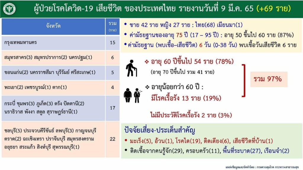 แพทย์หญิงสุมณี กล่าวว่า พบผู้เสียชีวิต 69 ราย ส่งผลให้ยอดเสียชีวิตสะสมตั้งแต่ปี 2563 อยู่ที่ 23,438 ราย คิดเป็น 0.76% แบ่งเป็นเพศชาย 42 ราย เพศหญิง 27 ราย คนไทย 68 คน เมียนมา 1 คน ค่าเฉลี่ยอายุอยู่ที่ 75 ปี โดยกลุ่มผู้เสียชีวิตอายุ 60 ปีขึ้นไป อยู่ที่ 54 ราย อายุน้อยกว่า 60 ปี และมีโรคเรื้อรัง 13 ราย โดยปัจจัยเสี่ยงและประเด็นสำคัญ คือ พบผู้ป่วยเป็นโรคมะเร็ง5 คน โรคอ้วน 1 คน โรคไต 19 คน ผู้ป่วยติดเตียง 6 คน เสียชีวิตที่บ้าน 1 คน รูปแบบการได้รับเชื้อคือ ติดเชื้อจากคนรู้จัก 29 คน ครอบครัว 11 คน พื้นที่ระบาด 27 คน และเรือนจำ 2 คน