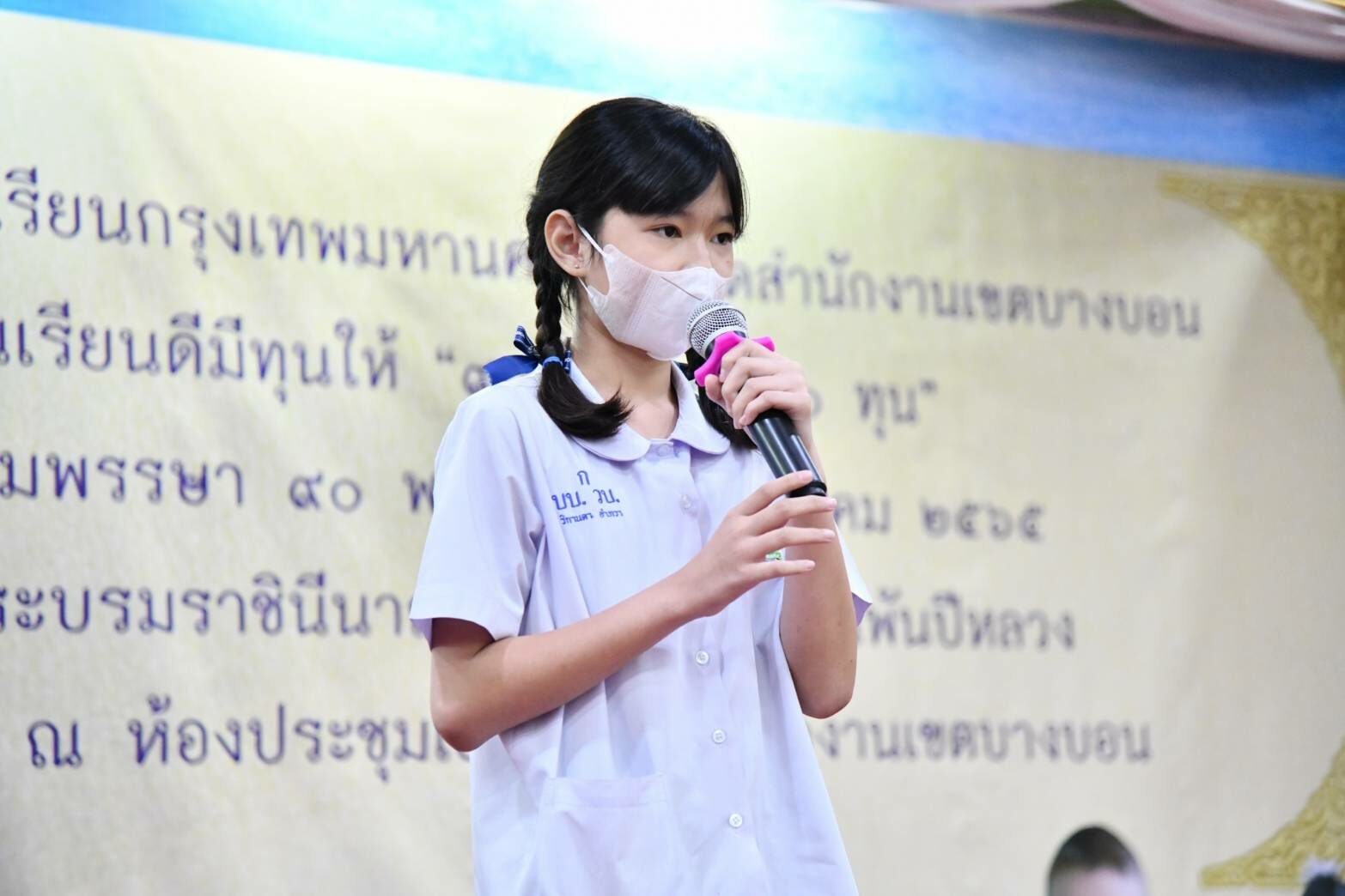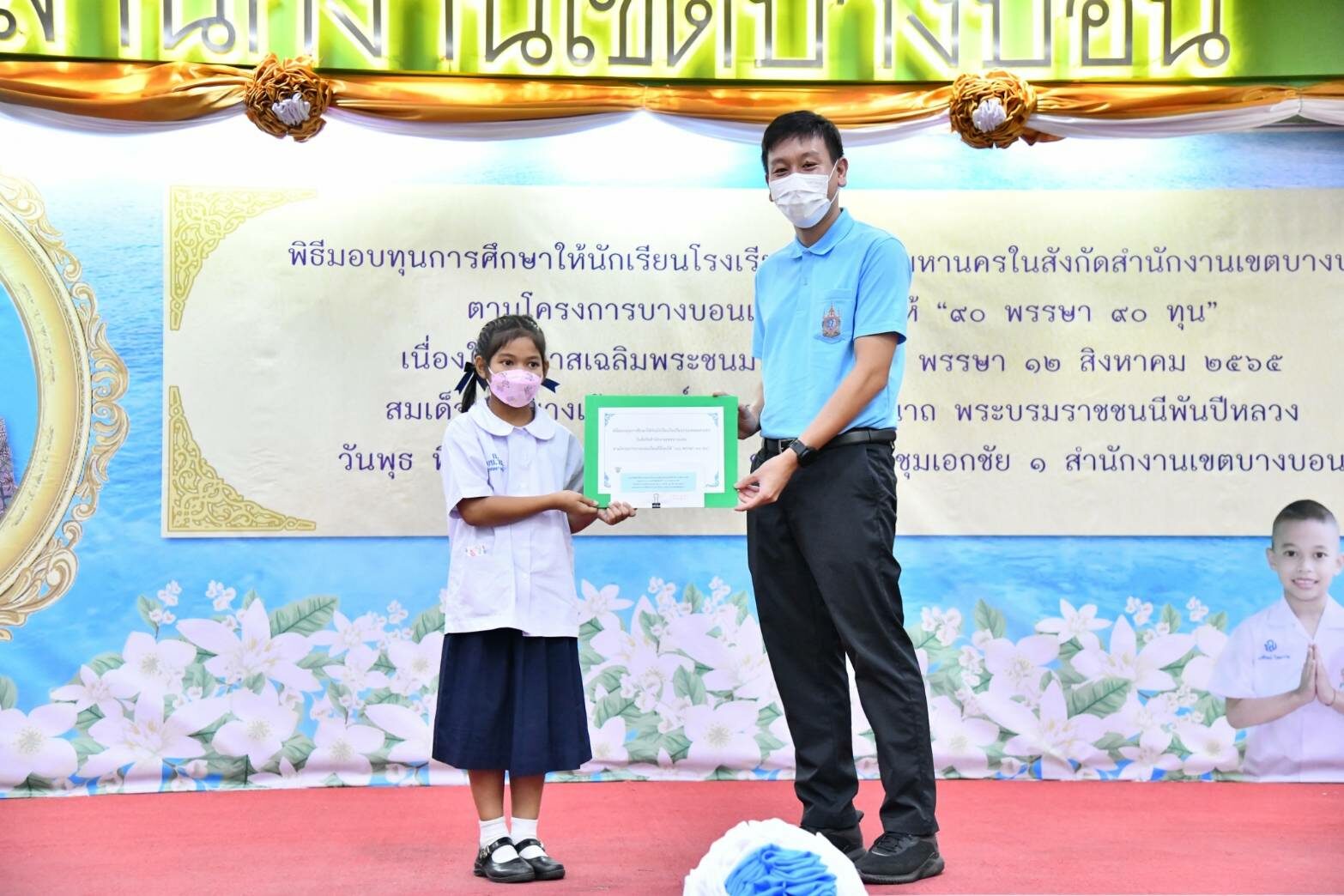 ทั้งนี้ เนื่องในโอกาสเฉลิมพระชนมพรรษา 90 พรรษา 12 สิงหาคม 2565 สมเด็จพระนางเจ้าสิริกิติ์ พระบรมราชินีนาถ พระบรมราชชนนีพันปีหลวง ผู้บริหารเขตบางบอน ข้าราชการ บุคลากรในสำนักงานเขตบางบอน และผู้มีจิตเมตตาในพื้นที่เขตบางบอนได้ร่วมกันสละทุนทรัพย์ส่วนตัว รวมเป็นเงิน 270,000 บาท เพื่อมอบทุนการศึกษา “บางบอนเรียนดีมีทุน” ให้แก่เด็กนักเรียนโรงเรียนในสังกัดสำนักงานเขตบางบอนที่มีผลการเรียนดีแต่ขาดแคลนทุนทรัพย์ ทั้ง 9 โรงเรียน จำนวน 90 ทุน ทุนละ 3,000 บาท ในระดับชั้นประถมศึกษาปีที่ 4 ขึ้นไป มีผลการเรียนระดับดีถึงดีมาก มีความประพฤติดี มีความมุ่งหวังในการศึกษาต่อในระดับที่สูงขึ้นไป และเป็นครอบครัวมีรายได้น้อย เพื่อเป็นการความช่วยเหลือและลดภาระค่าใช้จ่ายของผู้ปกครอง อีกทั้งส่งเสริมคุณภาพชีวิตและการเรียนของนักเรียน ซึ่งสอดคล้องกับนโยบายให้การศึกษา พัฒนานักเรียนสู่พลเมืองโลก ของผู้ว่าราชการกรุงเทพมหานคร ในมิติที่ 6 เรียนดี