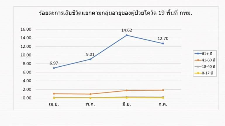 นพ.เฉวตสรร กล่าวอีกว่า สำหรับรายละเอียดผู้เสียชีวิต จำนวน 239 คน พบว่าอยู่ในกรุงเทพฯ 79 คน ส่วน สมุทรปราการ นนทบุรี สมุทรปราการ นครปฐม ปทุมธานี รวม 53 คน จำนวนนี้พบว่าผู้สูงอายุ 60 ปีขึ้นไป 158 คน และน้อยกว่า 60 ปี แต่มีโรคเรื้อรัง จำนวน 60 คน และหญิงตั้งครรภ์ชาวเมียนมาใน จ.สมุทรสาคร 1 คน หากแยกตามกลุ่มอายุของผู้เสียชีวิต ในกรุงเทพฯ มีข้อมูลที่น่าสนใจว่าอายุ 61 ปีขึ้นไป มีอัตราเสี่ยงสูง โดยสถิติช่วงเดือน เม.ย.64 ร้อยละ 6.97 เดือน พ.ค.64 ร้อยละ 9.1 เดือน มิ.ย.64 ร้อยละ 14.62 และเดือน ก.ค.64 ร้อยละ 12.70