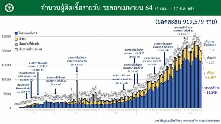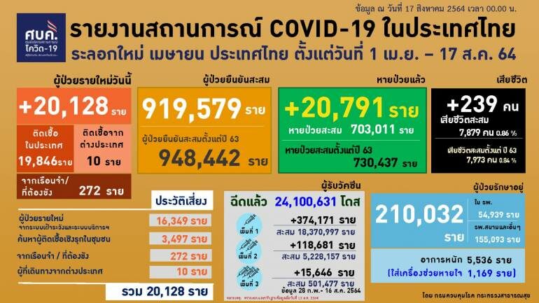 วันนี้ (17 ส.ค.64) นพ.เฉวตสรร นามวาท ผู้อำนวยการกองควบคุมโรคและภัยสุขภาพในภาวะฉุกเฉิน กระทรวงสาธารณสุข (สธ.) แถลงรายงานสถานการณ์โรคโควิด-19 ในประเทศไทย ว่า ไทยพบผู้ติดเชื้อรายใหม่อีก 20,128 รคน ยอดผู้ป่วยยืนยันสะสมแล้ว 948,442 คน ผู้เสียชีวิตเพิ่มอีก 239 คน รวมผู้เสียชีวิตสะสม 7,879 คน ขณะนี้มีการฉีดวัคซีนโควิด-19 ยอดสะสม 24 ล้านโดส เป็นเข็มที่ 1 จำนวน 18.3 ล้านโดส ส่วนเข็มที่ 2 จำนวน 5.2 ล้านโดส หรือ ร้อยละ 7.3 และเข็มที่ 3 จำนวน 501,477 คน นอกจากนี้ ยังมีชาวต่างชาติในประเทศไทยฉีดไปแล้ว 356,337 คน