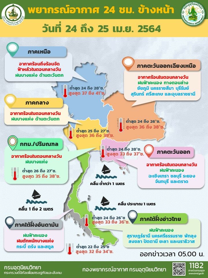 วันที่ 24 เม.ย.64 กรมอุตุนิยมวิทยา พยากรณ์อากาศ 24 ชั่วโมงข้างหน้า ประเทศไทยมีอากาศร้อนถึงร้อนจัดในตอนกลางวัน กับมีฝนฟ้าคะนองบางแห่ง ทั้งนี้เนื่องจากความกดอากาศต่ำเนื่องจากความร้อนยังคงปกคลุมประเทศไทยตอนบน ประกอบกับมีลมตะวันตกเฉียงใต้พัดนำความชื้นจากทะเลอันดามันและอ่าวไทยเข้ามาปกคลุมภาคตะวันออกเฉียงเหนือ ภาคกลาง ภาคตะวันออก รวมทั้งกรุงเทพมหานครและปริมณฑล ขอให้ประชาชนบริเวณประเทศไทยตอนบน ดูแลรักษาสุขภาพเนื่องจากสภาพอากาศที่ร้อนถึงร้อนจัดไว้ด้วย