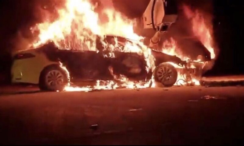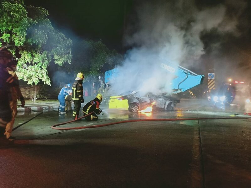 เจ้าหน้าที่จึงกั้นพื้นที่ปิดการจราจรในบริเวณดังกล่าวเพื่อความปลอดภัย เพื่อป้องกันการเกิดอุบัติเหตุซ้ำซ้อน จากนั้น เจ้าหน้าที่ดับเพลิงจึงลากสายยางฉีดน้ำใช้เวลานานกว่า 20 นาที เพลิงจึงสงบ เบื้องต้นเพลิงไหม้รถแท็กซี่คันดังกล่าวเสียหายทั้งหมด