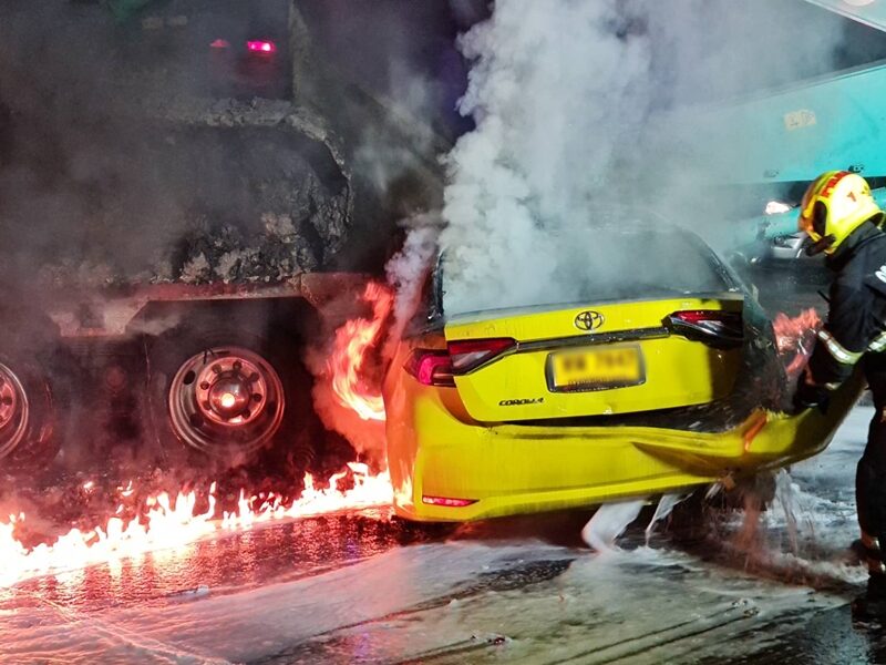 ที่เกิดเหตุเป็นถนน 3 เลน พบรถแท็กซี่ ยี่ห้อโตโยต้า รุ่นโคโลล่า สีเหลือง ทะเบียน ทฬ7847 กรุงเทพมหานคร โดยมีแสงเพลิงกำลังลุกไหม้รุนแรง และเสียงแก๊สระเบิดดังเป็นระยะ อยู่ในสภาพพุ่งชนกับรถบรรทุก 10 ล้อ ยี่ห้ออีซูซุ ทะเบียนป้ายเหลือง 63-7777 กรุงเทพมหานคร ที่ด้านหลังบรรทุกรถแบคโฮขุดดิน