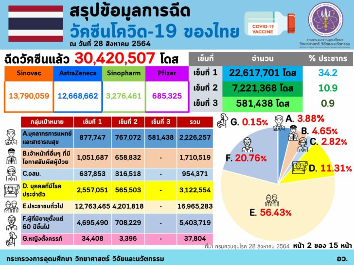 อว. เผยไทยฉีดวัคซีนแล้ว 30,420,507 โดส จังหวัดของไทยที่ฉีดมากที่สุด คือ กรุงเทพฯเข็มแรกกว่า 89.1%